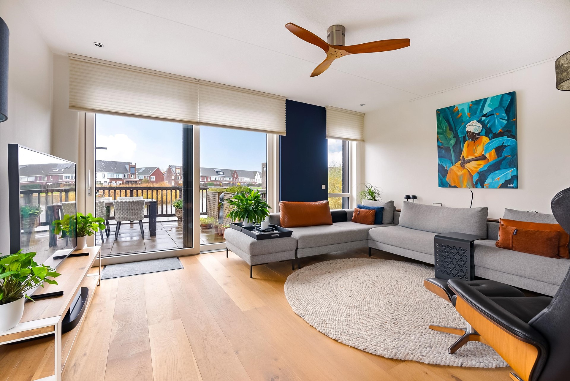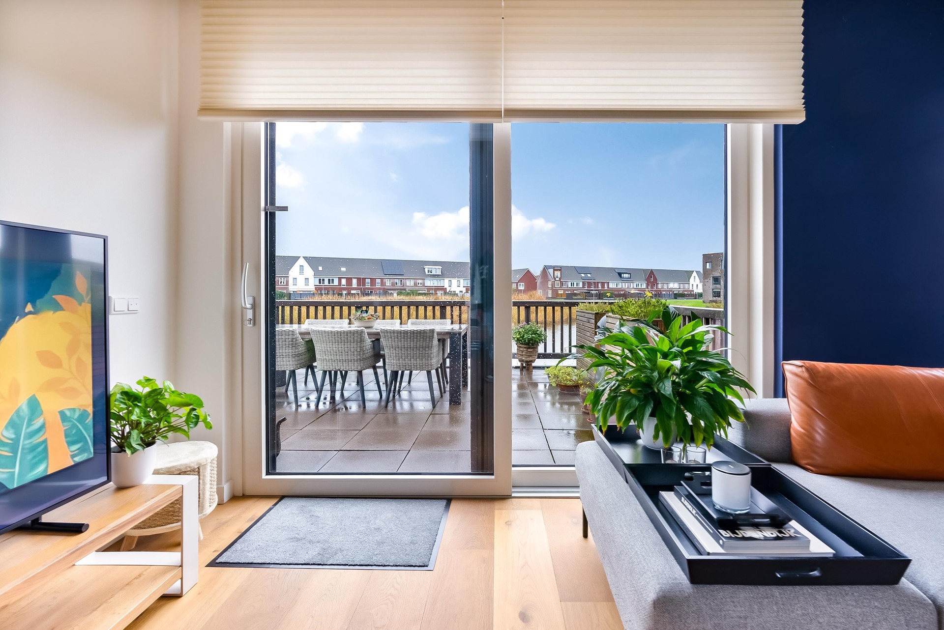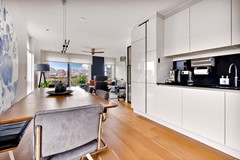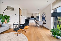 Entree met ruime hal, meterkast en toegang tot alle vertrekken. De woonkamer (ca. 39,7 m²) is een lichte en royale leefruimte met grote raampartijen, elektrische screens en een brede schuifpui naar het indrukwekkende terras aan het water. De hoeveelheid licht en het open uitzicht zorgen voor een heerlijk ruimtelijk gevoel.