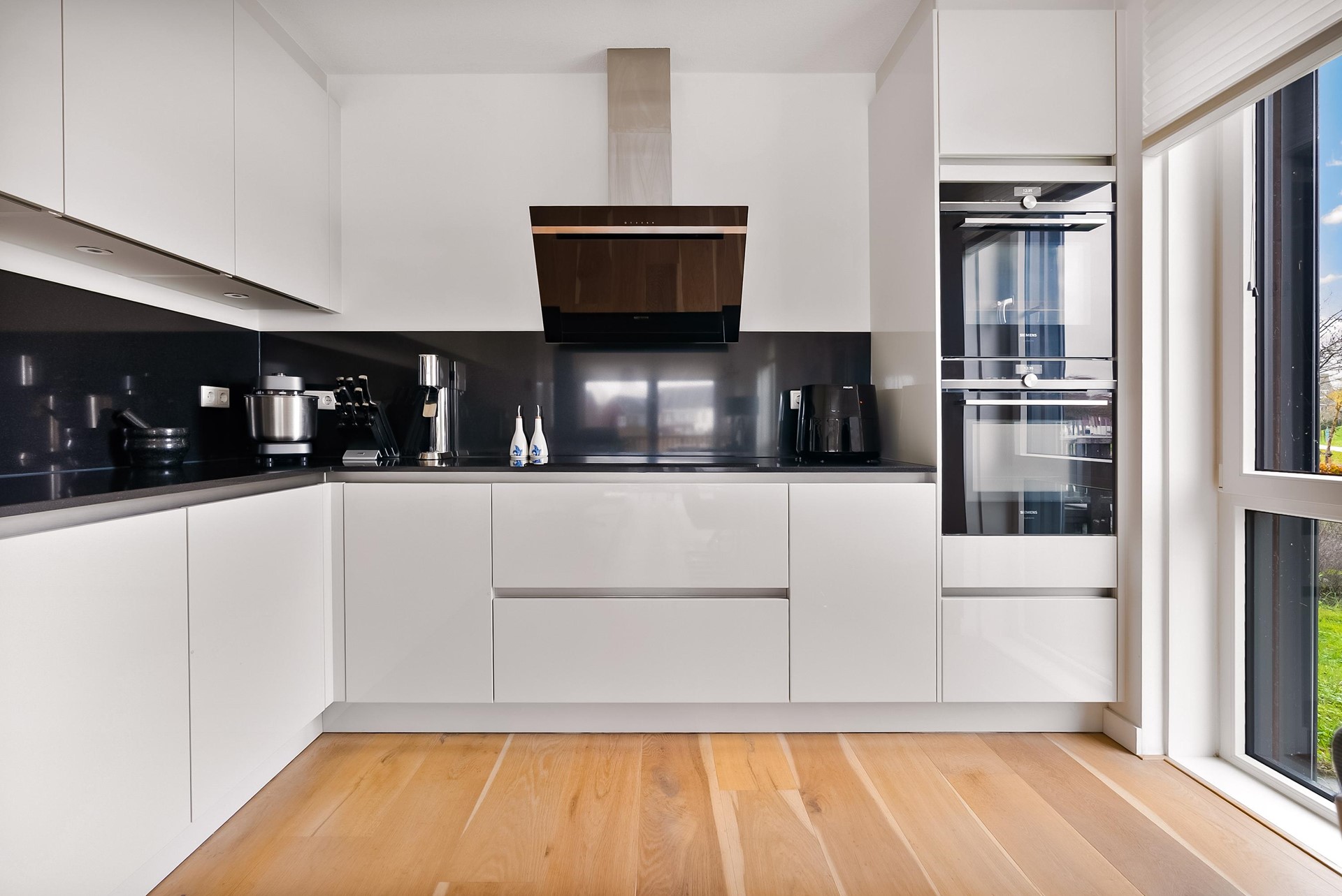 De moderne halfopen keuken (2019) bevindt zich aan de voorzijde en is voorzien van o.a. inductiekookplaat, combimagnetron, oven, vaatwasser, koel-vriescombinatie, afzuigkap en Quooker. Dankzij de praktische indeling en voldoende werkruimte is dit een fijne keuken voor dagelijks gebruik.