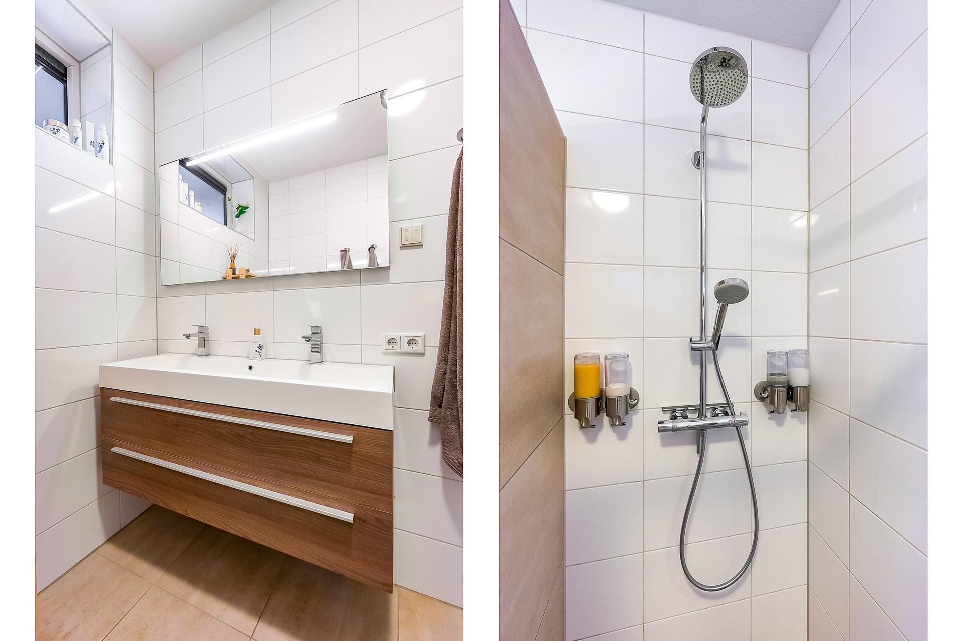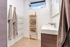 De badkamer (ca. 5,1 m²) is keurig afgewerkt en voorzien van een ruime inloopdouche, wastafelmeubel met opbergruimte, spiegel en elektrische radiator. Het separate toilet met fontein is eveneens modern uitgevoerd.