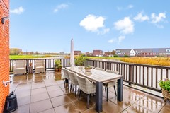 Het grote terras (ca. 25 m²) ligt direct aan de waterzijde. Het terras profiteert dankzij de volledig vrije ligging van een verrassend goed lichtinval: de zon valt op verschillende momenten van de dag langs of over het gebouw heen, waardoor er altijd wel een fijne plek met zon te vinden is.