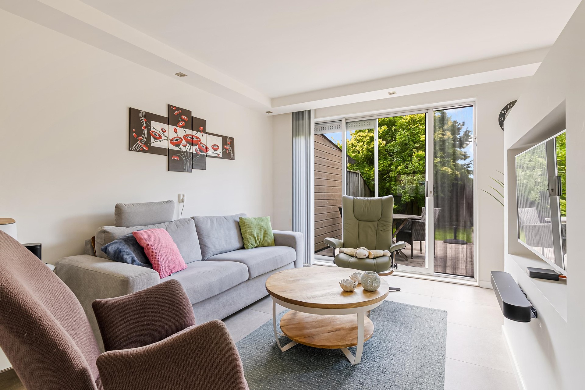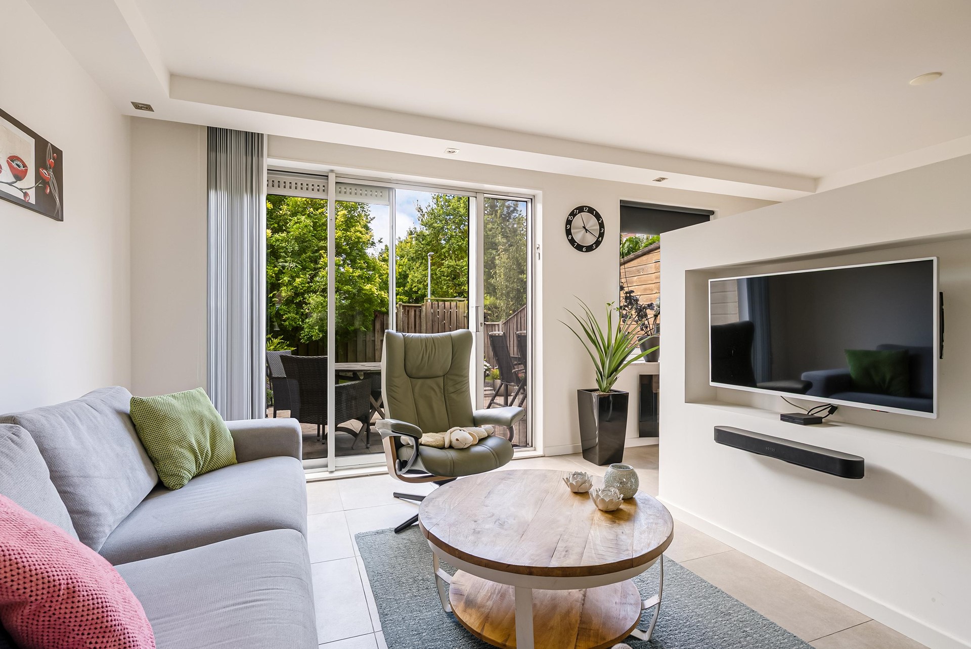 Ruime, lichte woonkamer met schuifpui, moderne plavuizen vloer met vloerverwarming en toegang tot de zonnige achtertuin.