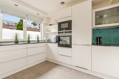 Aan de voorzijde bevindt zich de luxe keuken (2018) in U-opstelling, voorzien van Siemens-inbouwapparatuur waaronder inductiekookplaat, oven, magnetron, vaatwasser, koelkast en afzuigkap met afstandsbediening.