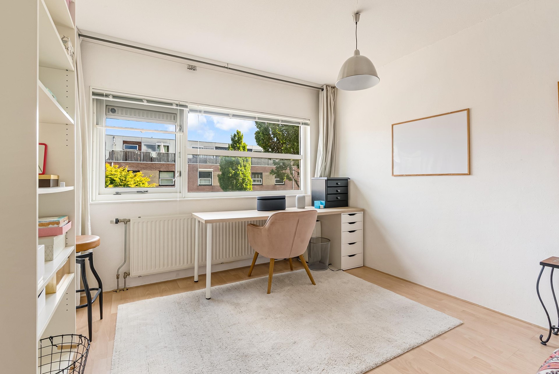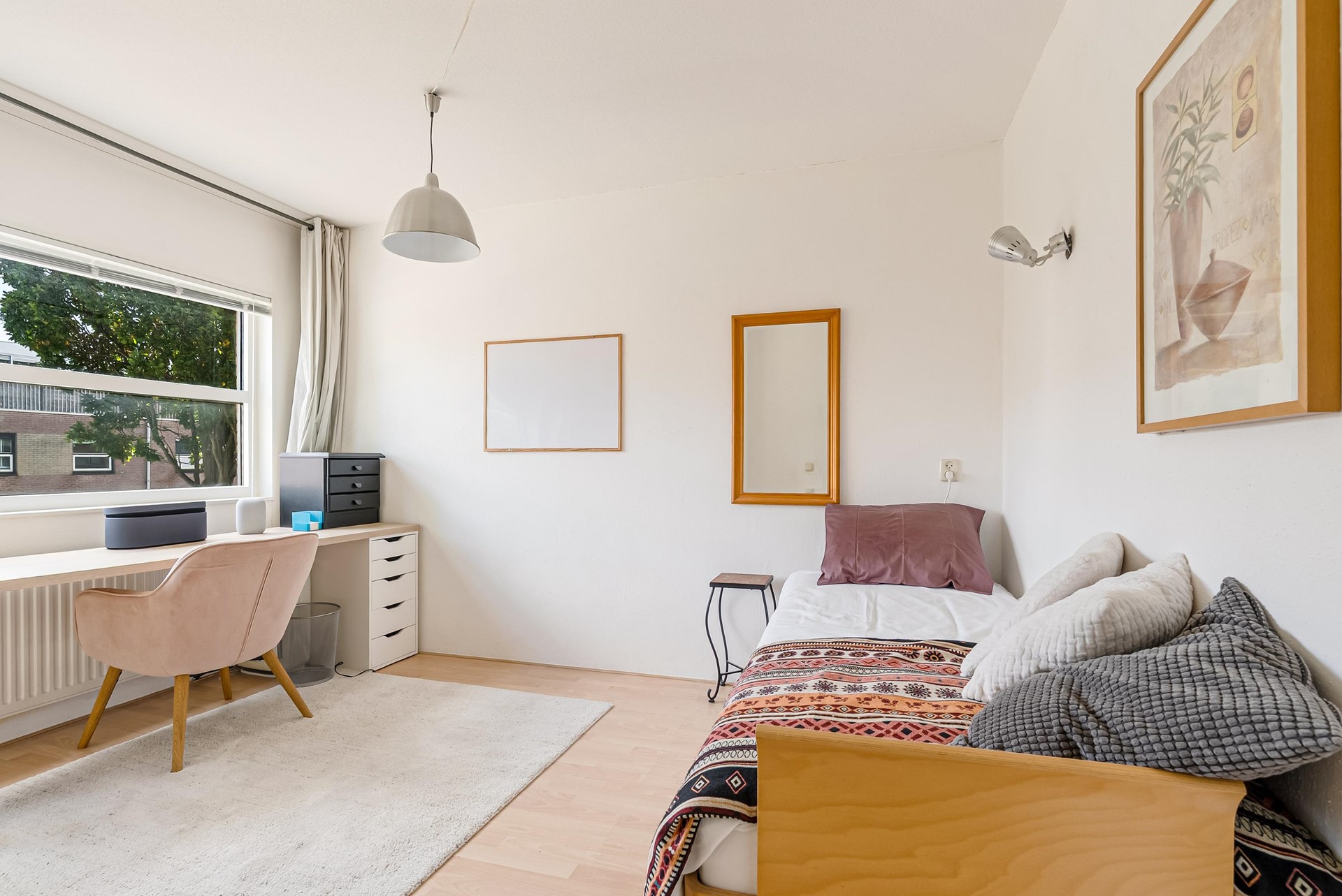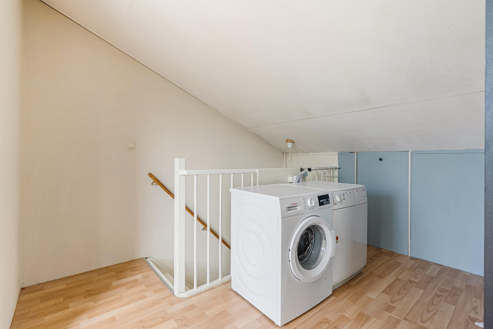 Via een vaste trap bereik je de vierde slaapkamer met laminaatvloer, kastenwand en wasruimte met wasmachine- en drogeraansluiting. Hier bevindt zich tevens het speelse dakterras van ca. 5.9 m². Ook is er genoeg bergruimte achter de knieschotten.