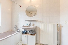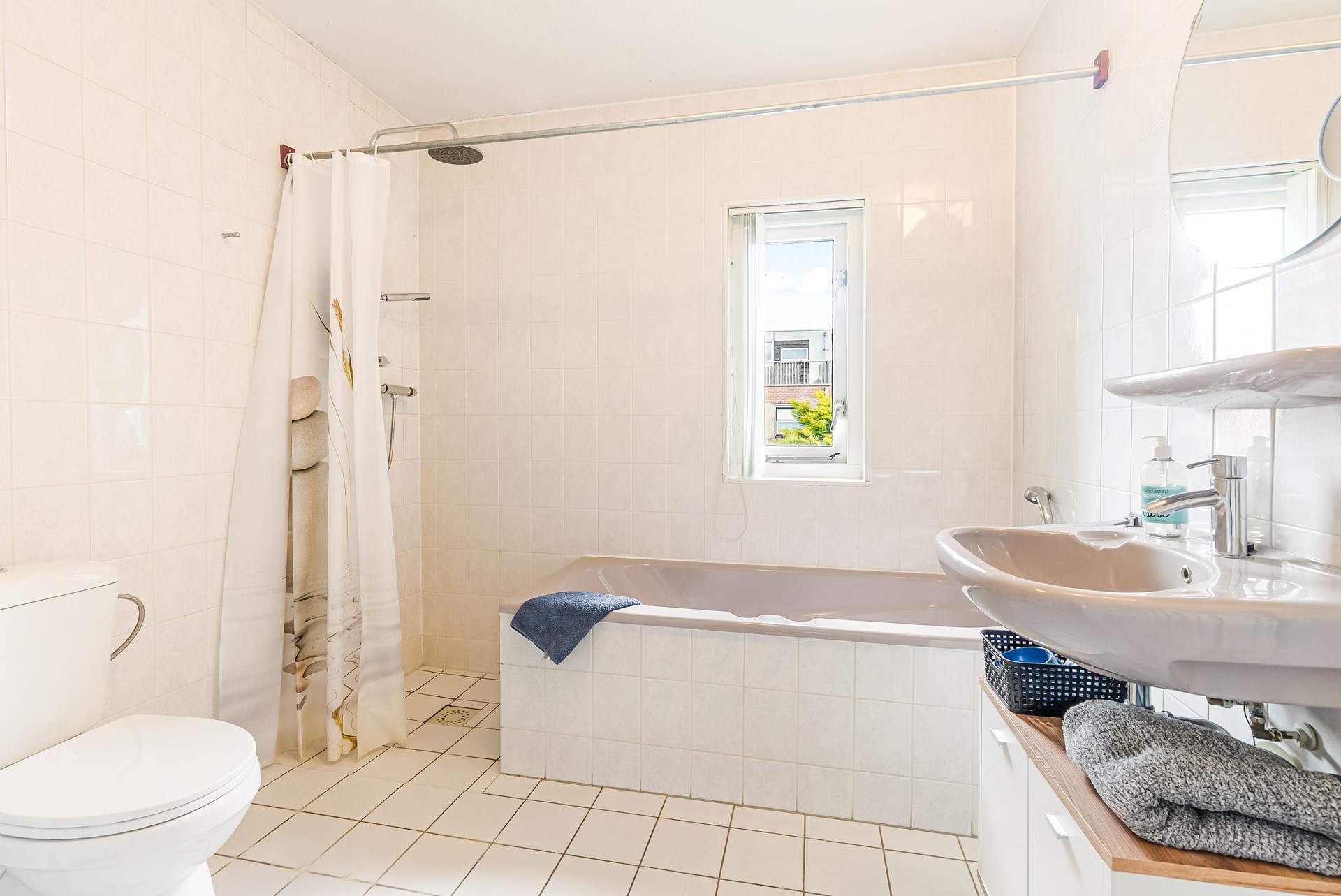 De nette badkamer beschikt over ligbad, douche, wastafelmeubel en een tweede toilet.