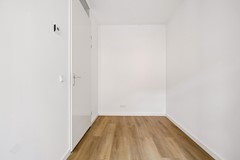 Terug in de hal zijn de twee slaapkamers te vinden, met een oppervlakte van circa 12,9 m² en 6,5 m², beide van goed formaat en flexibel in te richten als slaap-, werk- of logeerkamer. De badkamer heeft een oppervlakte van circa 4,6 m² en is strak en modern afgewerkt, voorzien van een douche en wastafel. Daarnaast is er een separate toiletruimte aanwezig.