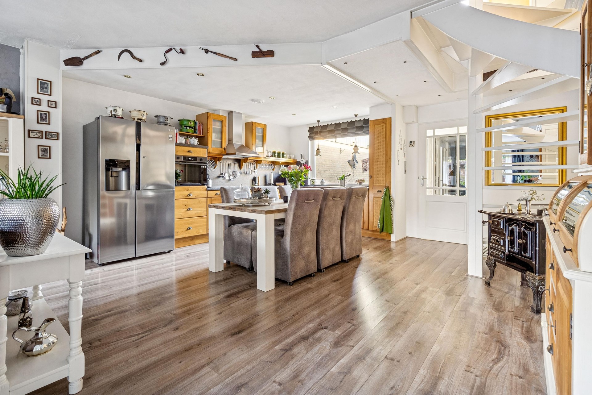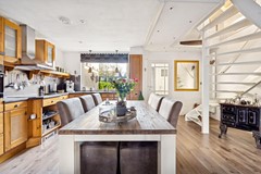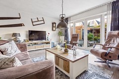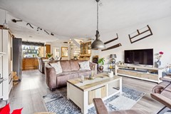 De woonkamer is opvallend ruim en meet circa 48,2 m², met volop plaats voor een royale zithoek en een grote eettafel. De grote raampartijen zorgen voor een prettige lichtinval en via de dubbele deuren is er direct toegang tot de achtertuin.
