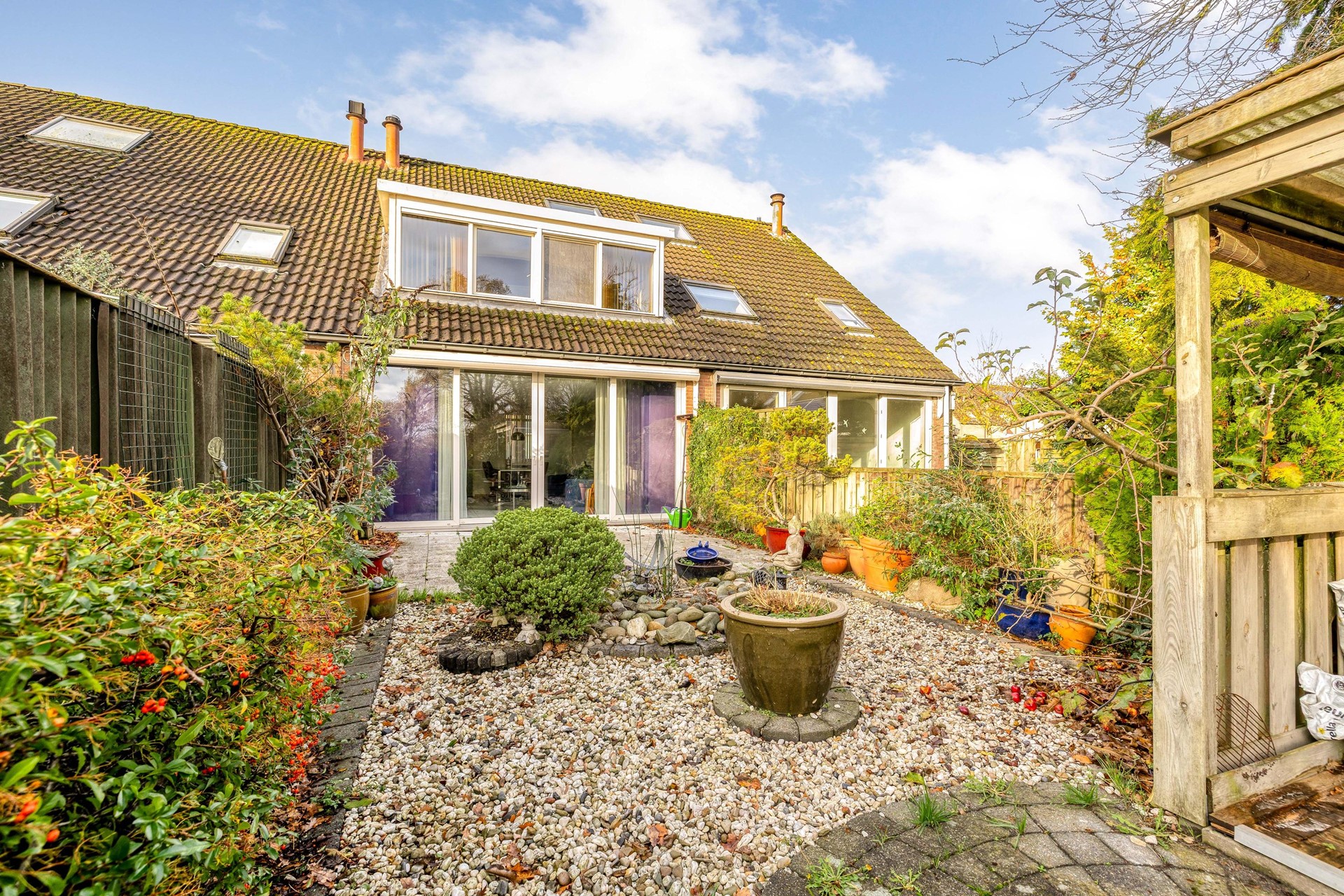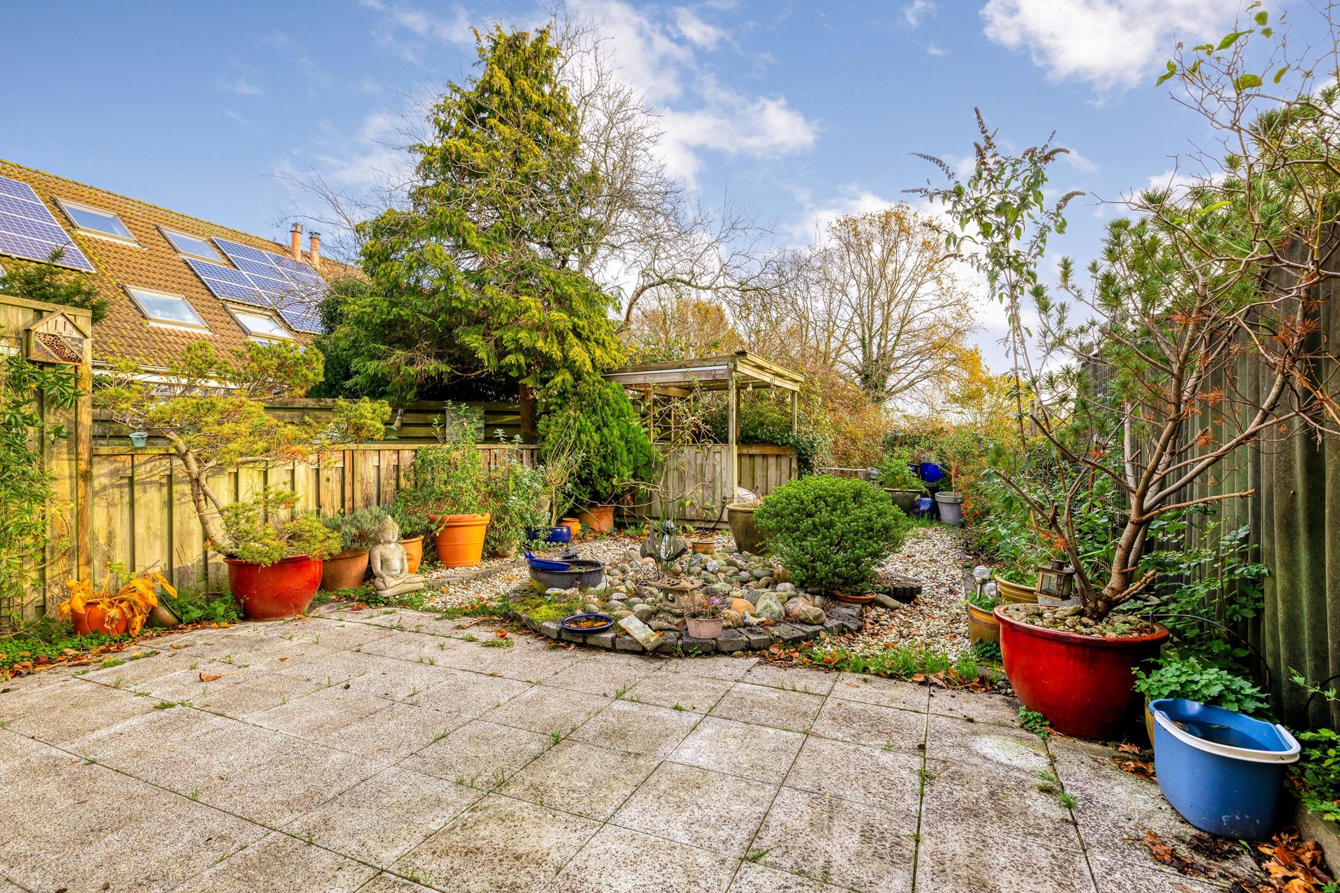 De achtertuin is een sfeervolle en groene buitenruimte met een prettige diepte. Dankzij de brede schuifpui vormt de tuin een mooi verlengstuk van de woonkamer.