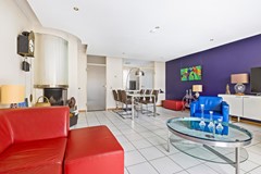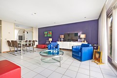 Entree met meterkast, trapopgang en nette toiletruimte. Vanuit de hal toegang tot de ruime woonkamer (ca. 34 m²) met een brede schuifpui, waardoor er veel daglicht binnenvalt. De woonkamer beschikt over een werkende open haard, en is prettig in te delen in een zitgedeelte en een eetgedeelte.