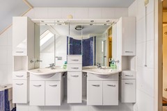 - Badkamer (ca. 7,5 m²) voorzien van een douche, dubbele wastafel, bidet en radiator.