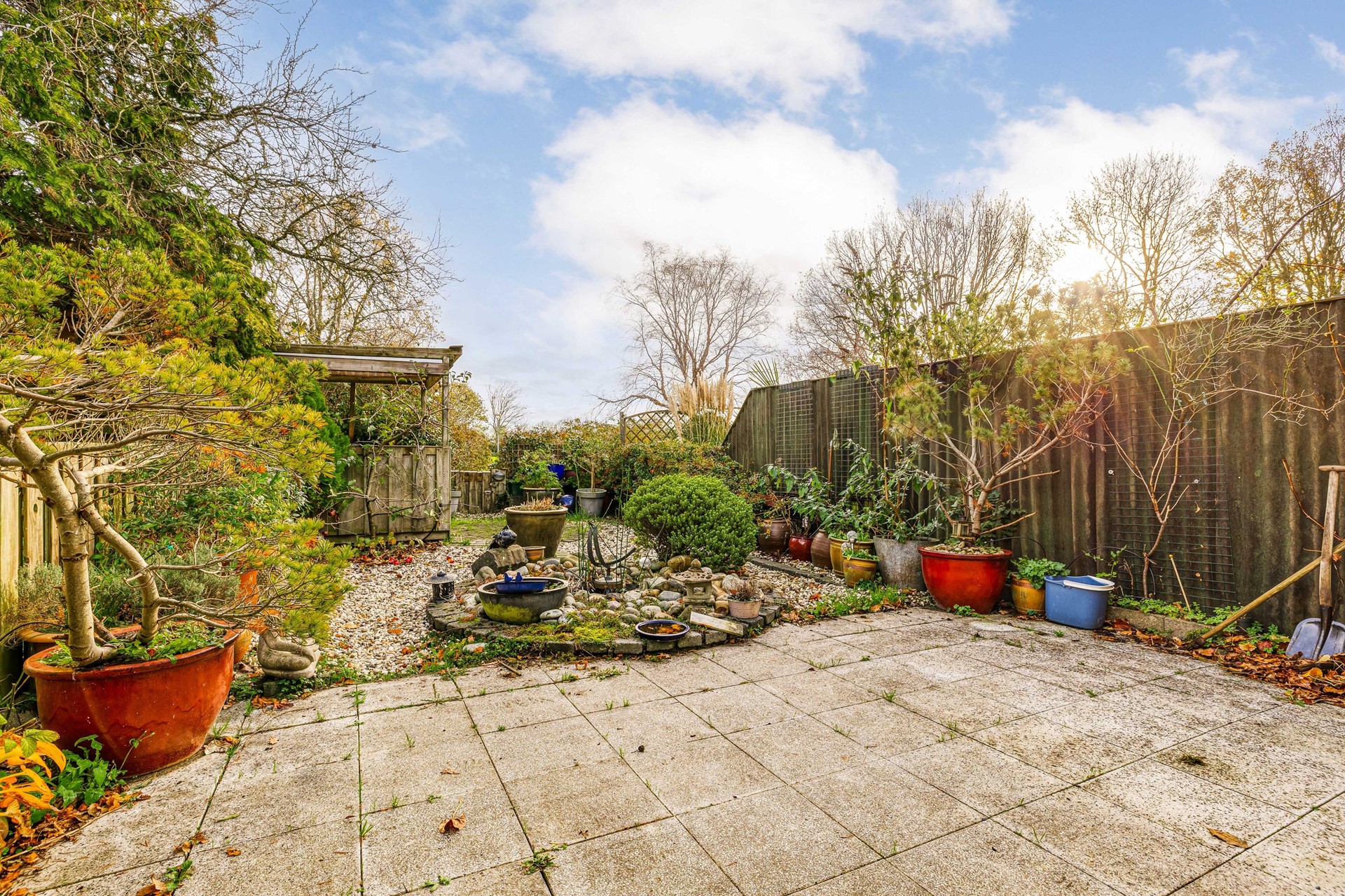 De tuin is onderhoudsvriendelijk aangelegd met een combinatie van bestrating, groen en diverse plantenborders. Achterin de tuin bevindt zich een beschut zitgedeelte onder een houten overkapping, perfect voor een loungeset of tuintafel.