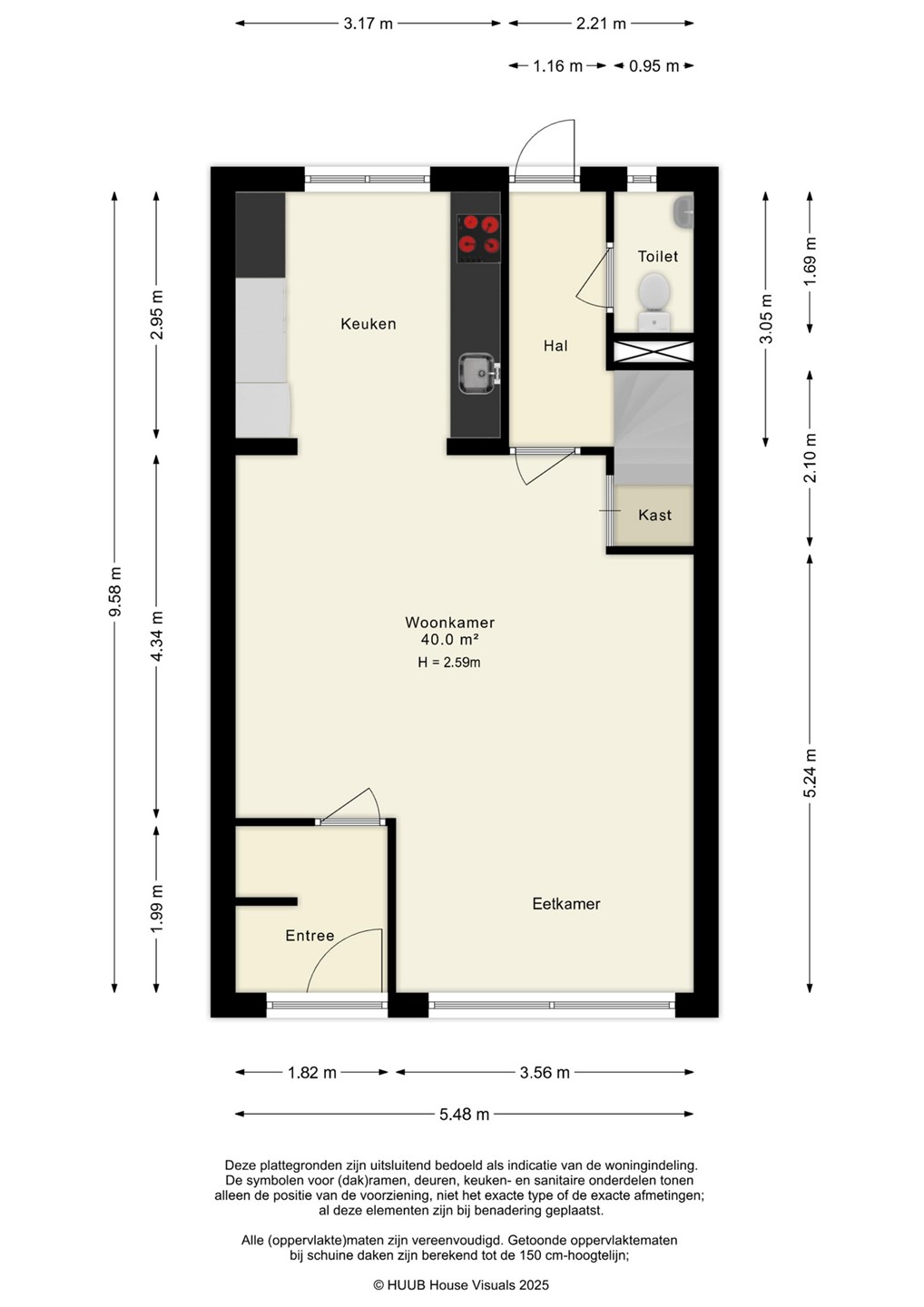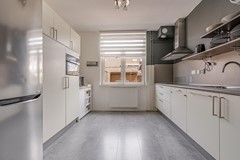 Entree/hal met meterkast (2023 vernieuwd), toiletruimte (2020) en trapopgang. Royale woonkamer van ca. 40 m² met strakke laminaatvloer (2020). Aan de achterzijde bevindt zich de open keuken (2011), uitgerust met o.a. een combi-magnetron, elektrische kookplaat, afzuigkap, vaatwasser en een inbouwvriezer. Aan de achterzijde zit nog een tussenhal met toegang tot toilet(2020), trapopgang en de achtertuin.