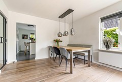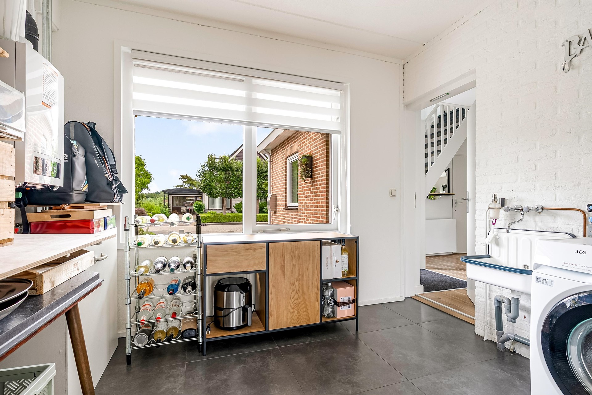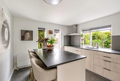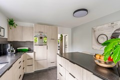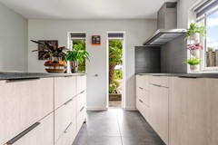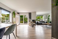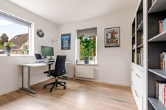 Entree/hal met moderne trapopgang, meterkast en toiletruimte. Vanuit de hal stap je zó het kantoor in van ca. 11.5 m², een fijne, rustige werkplek met zicht op de voortuin. Ook kom je via de hal naar de bijkeuken van ca. 8.5 m². Vanaf de bijkeuken heb je toegang tot de berging van ca. 9.4 m². De tuingerichte woonkamer is een fijne leefruimte met veel licht, een houten vloer en een gezellige hybride houtkachel. Deze hybride houtkachel is ter overname. De open keuken (2012) ligt aan de voorzijde en is uitgerust met inbouwapparatuur: inductiekookplaat (2018), vaatwasser (2024), oven (2012) en afzuigkap (2014). Vanuit de woonkamer stap je zo de ruime, fraai aangelegde achtertuin in met overkapping.