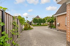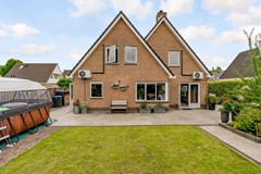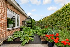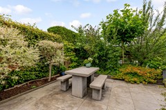 De achtertuin is royaal van formaat met een diepte van ca. 11 meter en een breedte van ca. 17,5 meter. Dankzij de breedte en slimme indeling is er volop ruimte voor verschillende zitplekken, een gazon én een royale overkapping met berging. De tuin is verzorgd aangelegd met sierbestrating, groenblijvende hagen en kleurrijke beplanting.