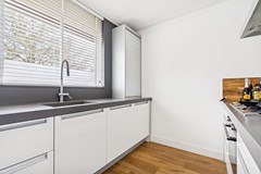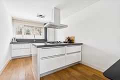 Aan de voorzijde van de woning bevindt zich de stijlvolle open keuken met schiereiland. De inbouwkeuken is uitgerust met een fraai composiet werkblad, een vrij hangende aluminium afzuigkap, een 5 pits gaskookplaat op het schiereiland, combimagnetron/oven, vaatwasser (2025), koelkast en kickspace verwarming in de plint. Bergruimte is volop in de keuken aanwezig door middel van grote lades. Een keuken die zowel praktisch als esthetisch overtuigt.