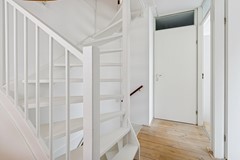 Ruime hal met meterkast en trapopgang. Moderne toiletruimte uitgevoerd met zwevend toilet en fontein. Vanuit de hal is de inpandige garage toegankelijk. De verwarmde garage is voorzien van plavuizen vloer, waterkraan met gootsteen, wasmachine en wasdrogeraansluiting, bergruimte in houten stellages. De garage beschikt over een stalen kanteldeur met loopdeur naar buiten.