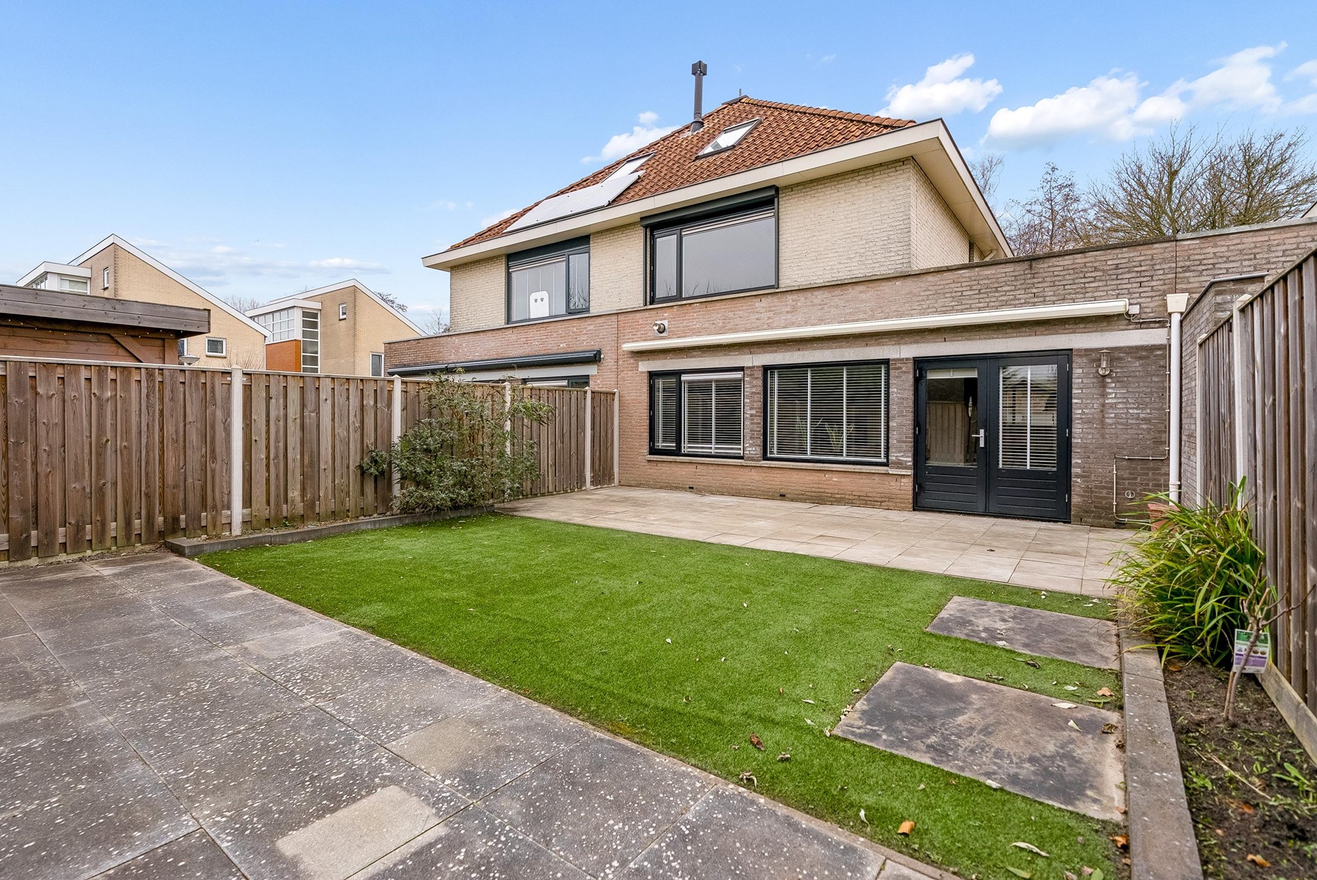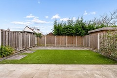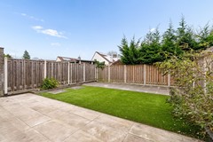 De tuin (afmetingen 8,5 meter breed en 10,5 meter diep), welke volledig op het zuiden is gelegen, is aangelegd met een combinatie van bestrating en kunstgras en beschikt over meerdere fijne zitplekken. De tuin biedt zeer veel privacy, aangezien er geen hoge bebouwing aan de achterzijde van de woning aanwezig is.