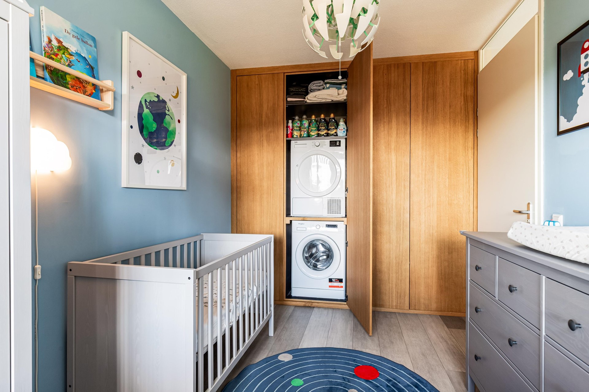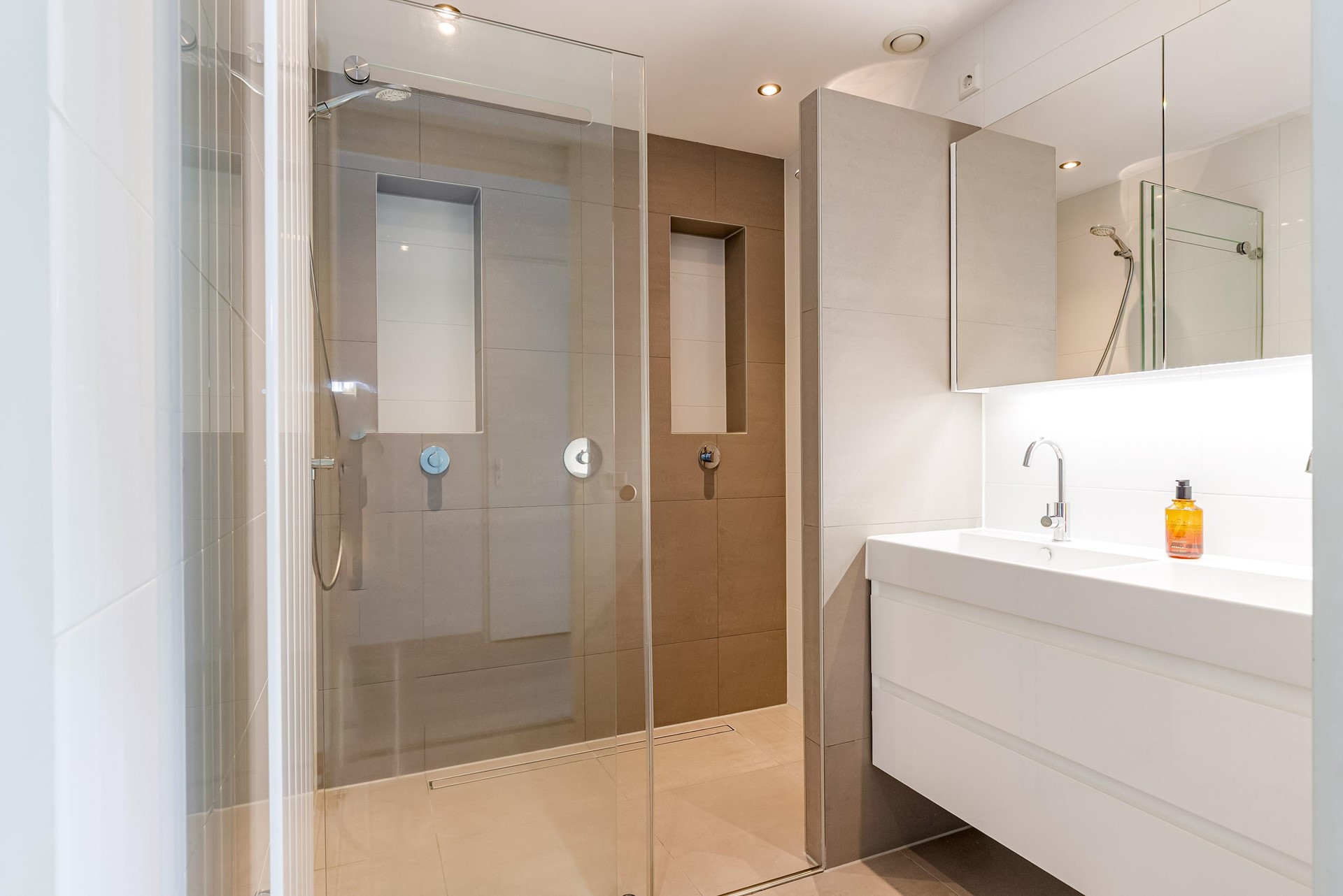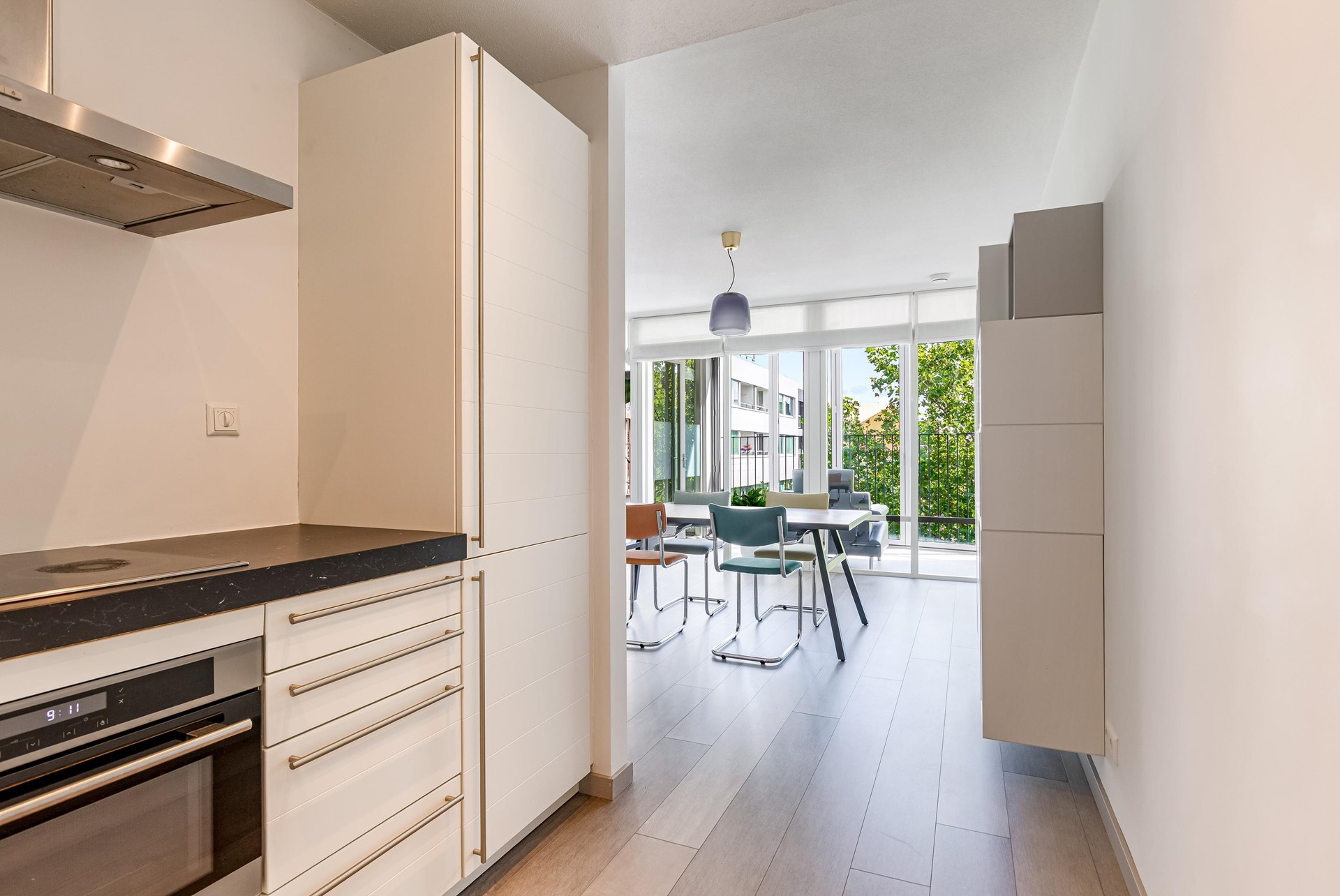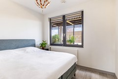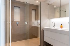 De open keuken is modern uitgevoerd en voorzien van diverse inbouwapparatuur. Het appartement beschikt over twee slaapkamers van ca. 9,1 m² en 9,7 m², een zeer nette, volledige afgewerkte badkamer met dubbele douche en een separaat toilet, wat zorgt voor een praktische en functionele indeling.