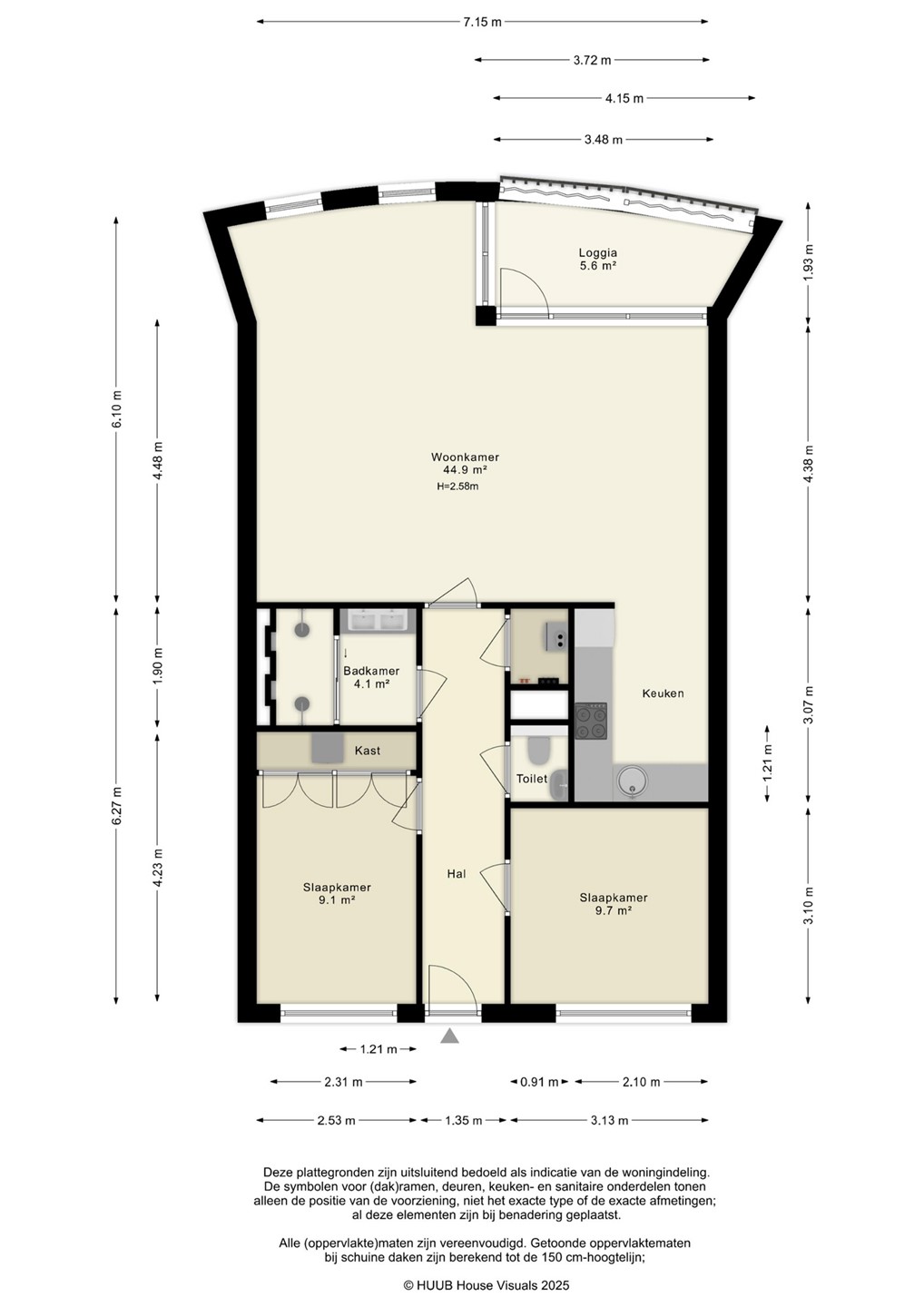 Entree, hal, separaat toilet, badkamer, twee slaapkamers (ca. 9,1 m² en 9,7 m²), royale woonkamer met open keuken en toegang tot de inpandige loggia.
