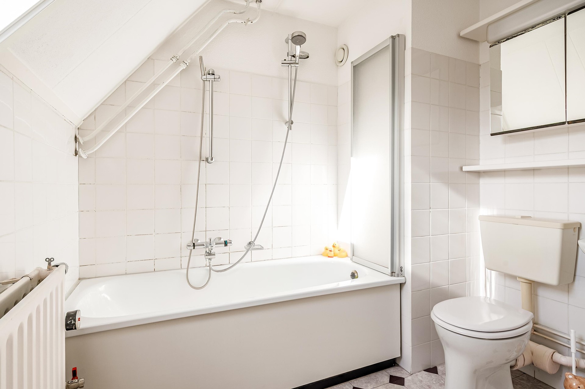 De overloop biedt toegang tot de drie slaapkamers en een complete badkamer. De slaapkamers zijn voorzien van raamverduistering, horren en laminaatvloeren. De ruime badkamer beschikt over een bad met douche, wastafel, toilet en aansluiting voor wasmachine en droger.