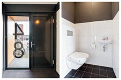 Entree, hal met meterkast en modern betegelde toiletruimte met vrij hangend toilet en fonteintje. Vanuit de hal bereikt u de inpandige (verwarmde) berging met opstelplaats voor de CV-ketel en mechanische ventilatie-unit, alsmede een loopdeur naar de voorzijde van de woning.