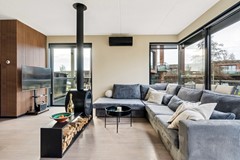 De royale woonkamer (ca. 41 m²) is dankzij de grote raampartijen tot aan de vloer uitzonderlijk licht. De sfeervolle ‘Dik Geurts’ houtkachel vormt het warme middelpunt van de ruimte. Middels de schuifpui heeft u toegang tot het riante dakterras met fraai uitzicht over het omliggende natuurgebied. Tevens is de woonkamer voorzien van een airco-installatie.