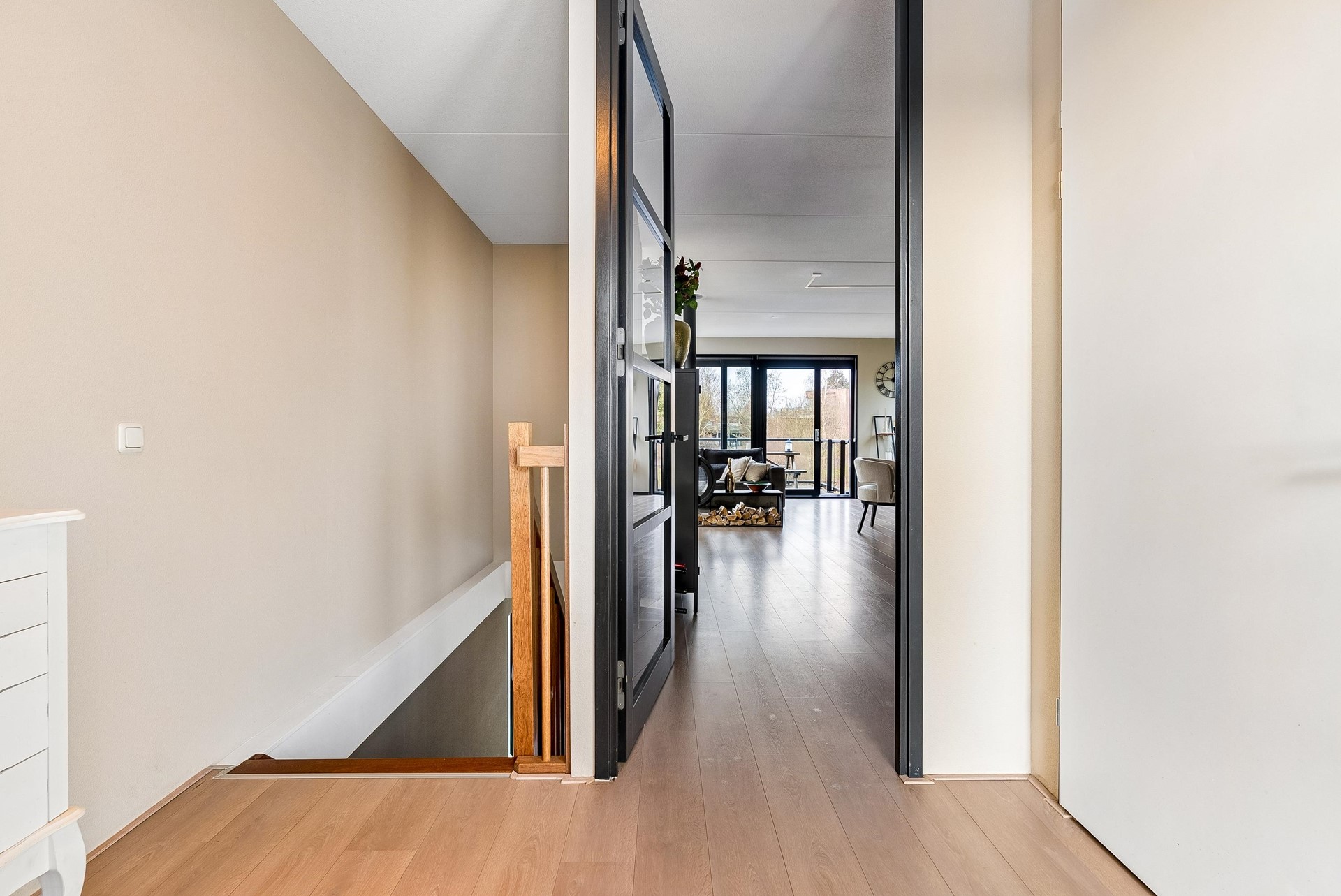 Royale overloop/hal. Drie ruime slaapkamers (respectievelijk ca. 19 m², 17,5 m² en 9 m²), allen met directe toegang tot het buitenterrein, waardoor deze woonlaag verrassend licht en ruim aanvoelt.
