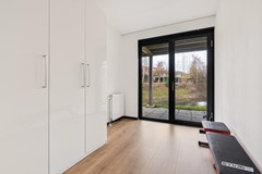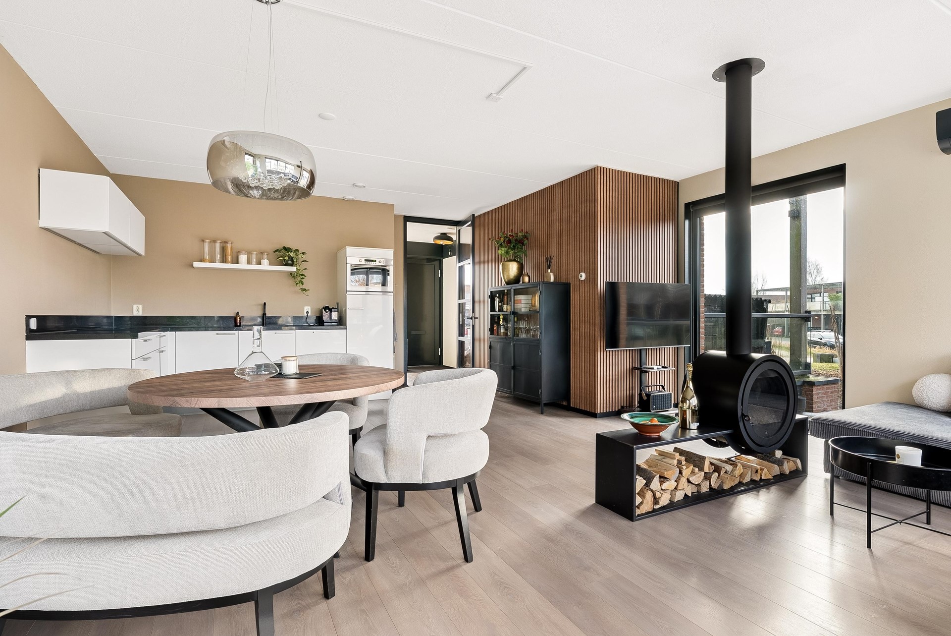 De royale woonkamer (ca. 41 m²) is dankzij de grote raampartijen tot aan de vloer uitzonderlijk licht. De sfeervolle ‘Dik Geurts’ houtkachel vormt het warme middelpunt van de ruimte. Middels de schuifpui heeft u toegang tot het riante dakterras met fraai uitzicht over het omliggende natuurgebied. Tevens is de woonkamer voorzien van een airco-installatie.
