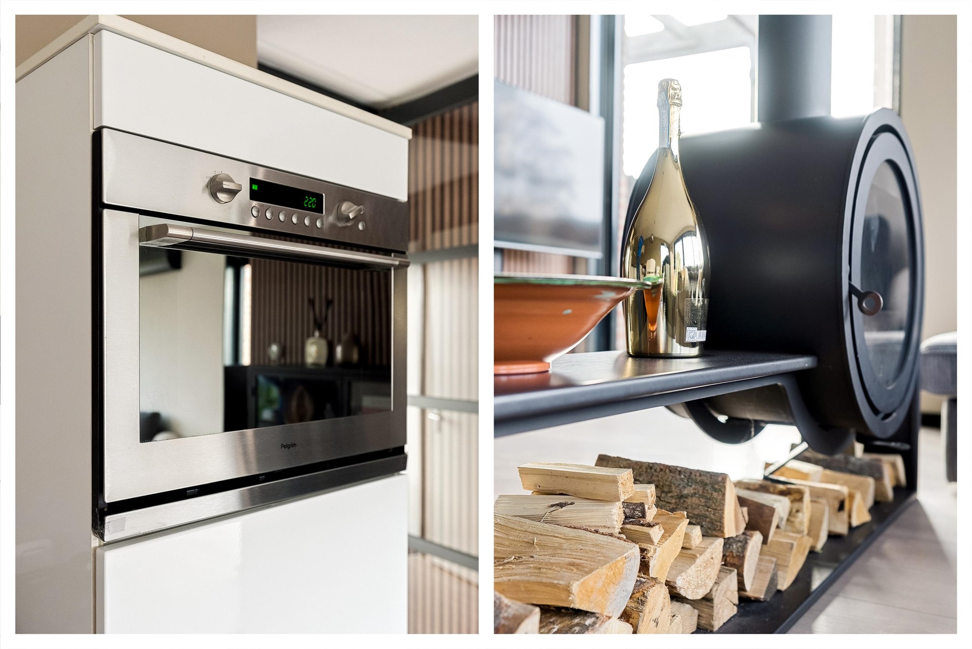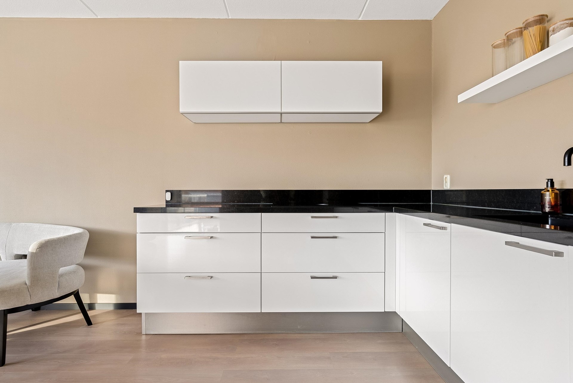 De moderne inbouwkeuken (2020) is uitgevoerd in lichte kleurstelling en voorzien van onder andere een Bora inductiekookplaat met geïntegreerde afzuiging, Quooker, oven/magnetron, koelkast en vaatwasser (2023).
