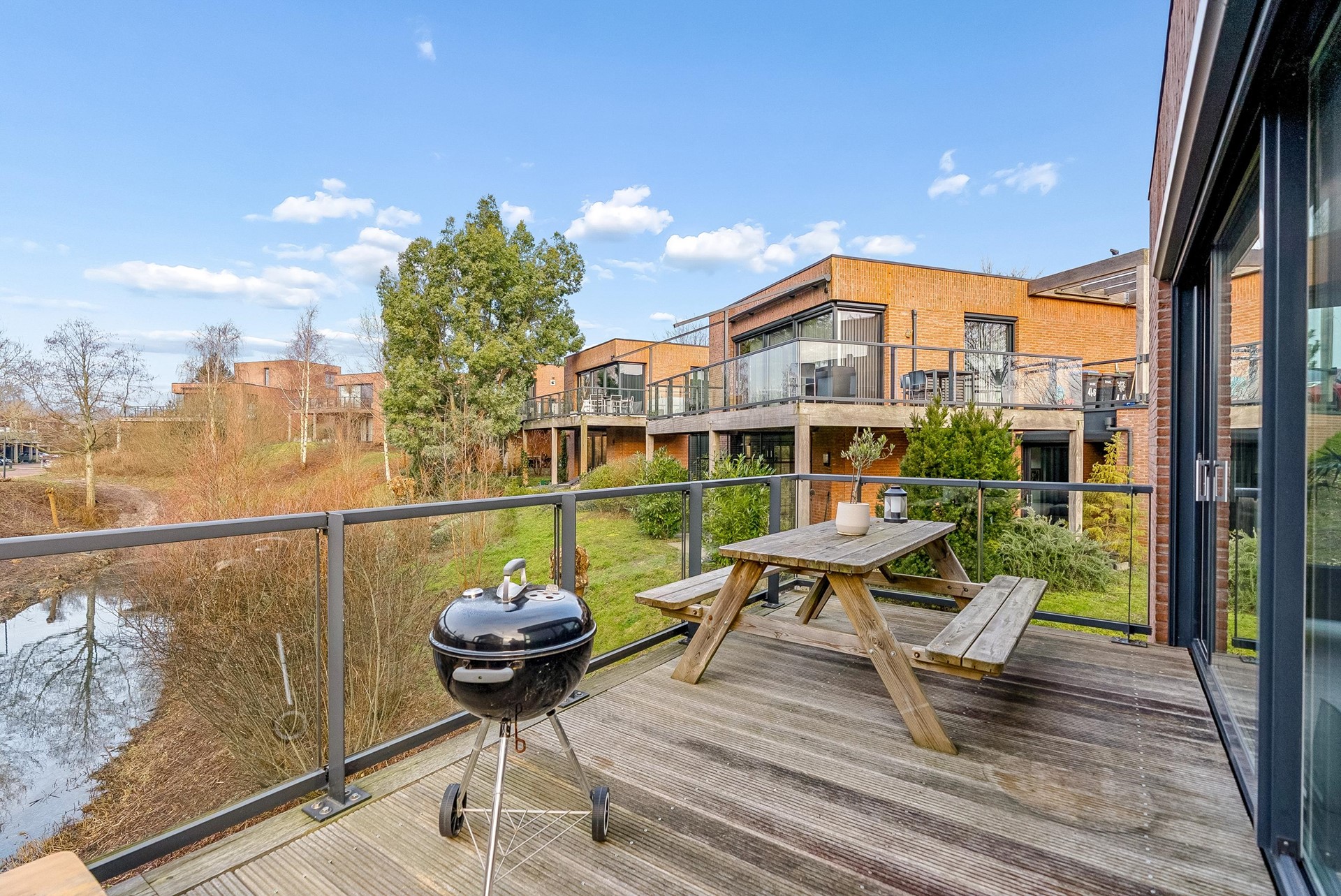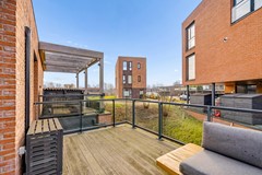 Vanuit de woonkamer, middels schuifpui, bereikt u het riante dakterras (ca. 30 m²) met een panoramisch uitzicht over het mandelige natuurgebied.