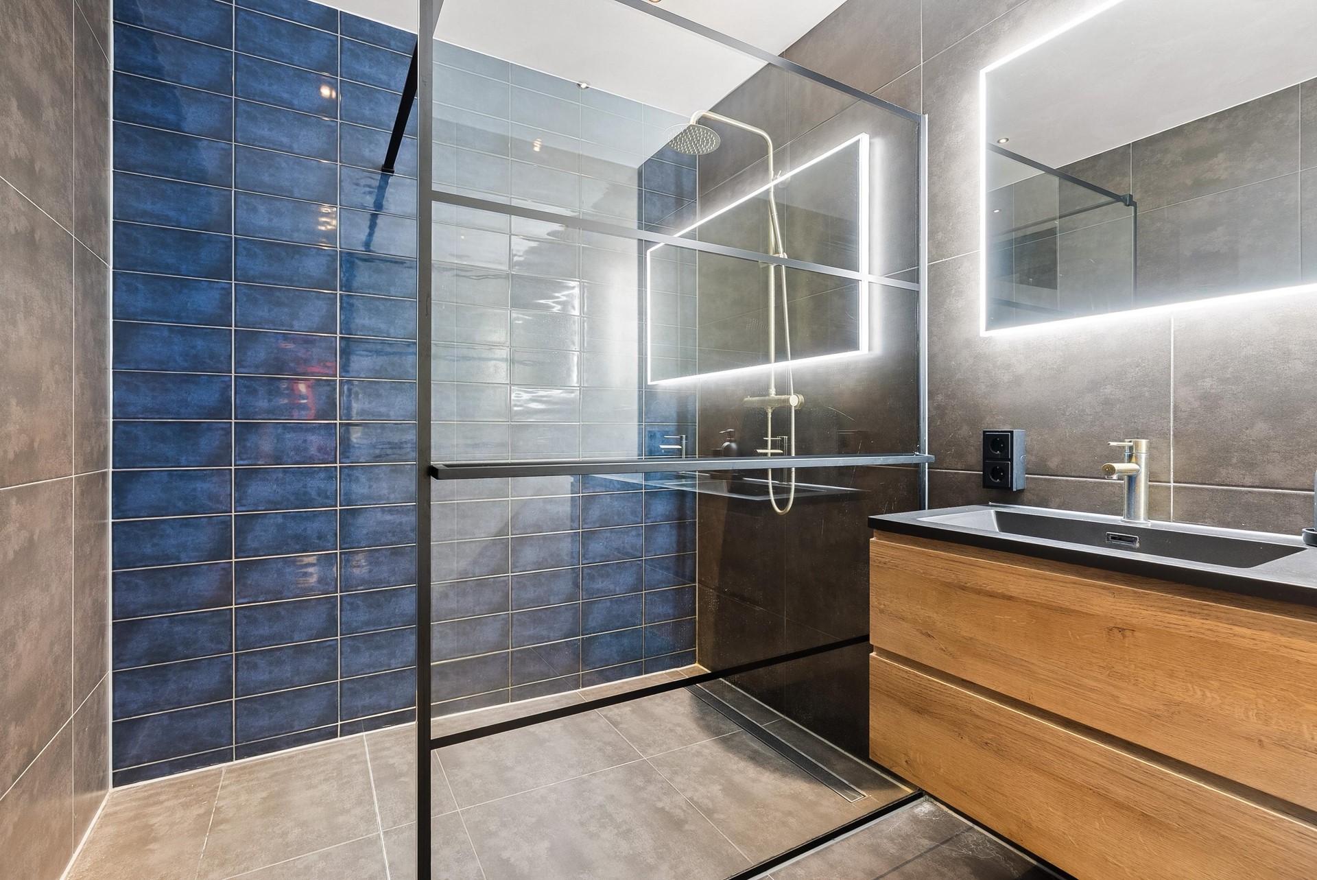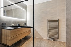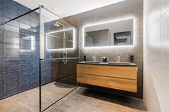 De luxe betegelde badkamer (2020) beschikt over een inloopdouche, breed badkamermeubel met dubbele wastafel en designradiator. Daarnaast is er een separate toiletruimte met tweede vrij hangend toilet en fonteintje.