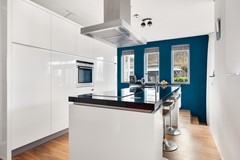 De moderne open keuken met kookeiland vormt het hart van de woning en is voorzien van diverse inbouwapparatuur. Dankzij de open indeling staat de keuken in directe verbinding met de eetkamer en de woonkamer.