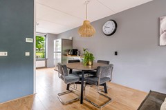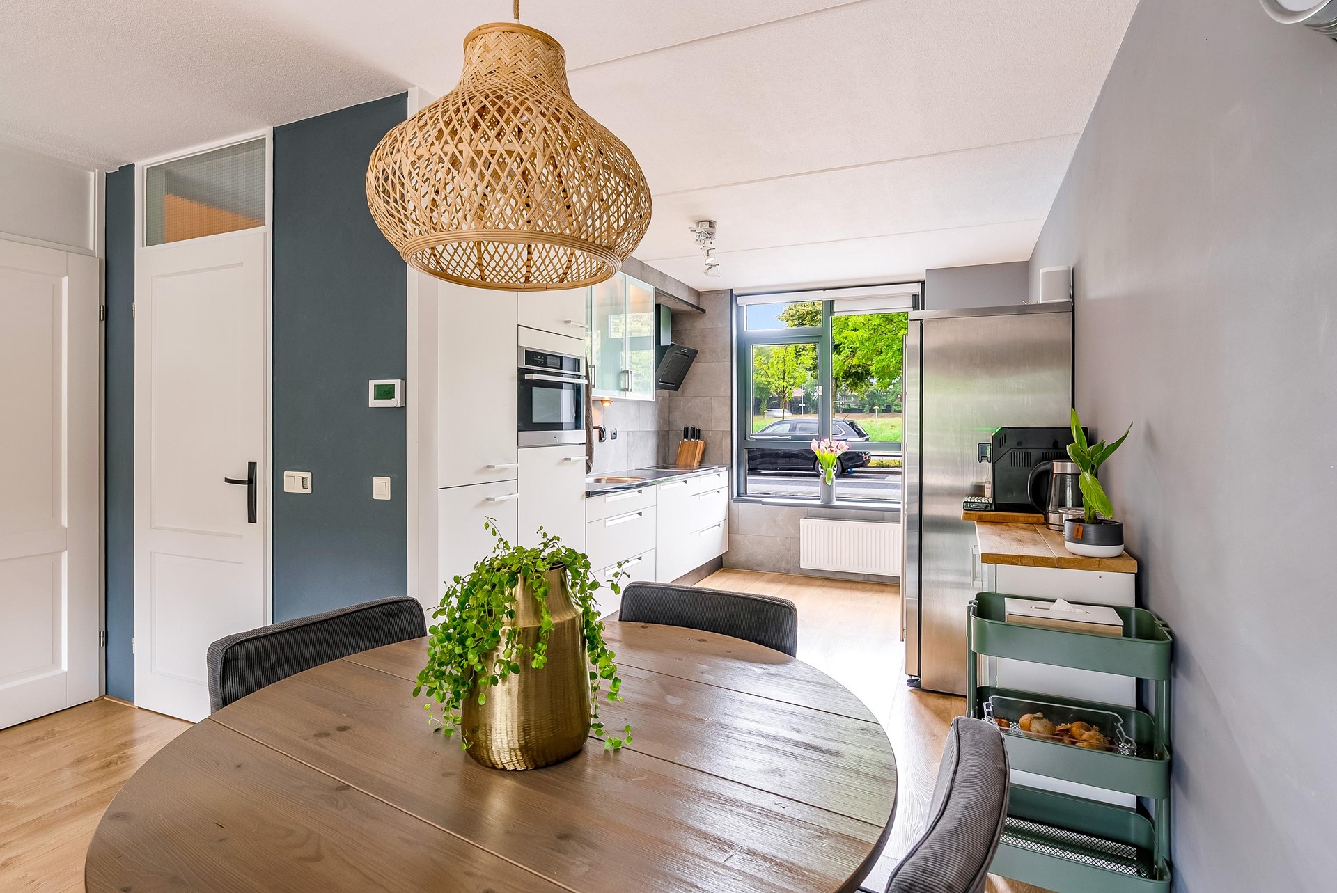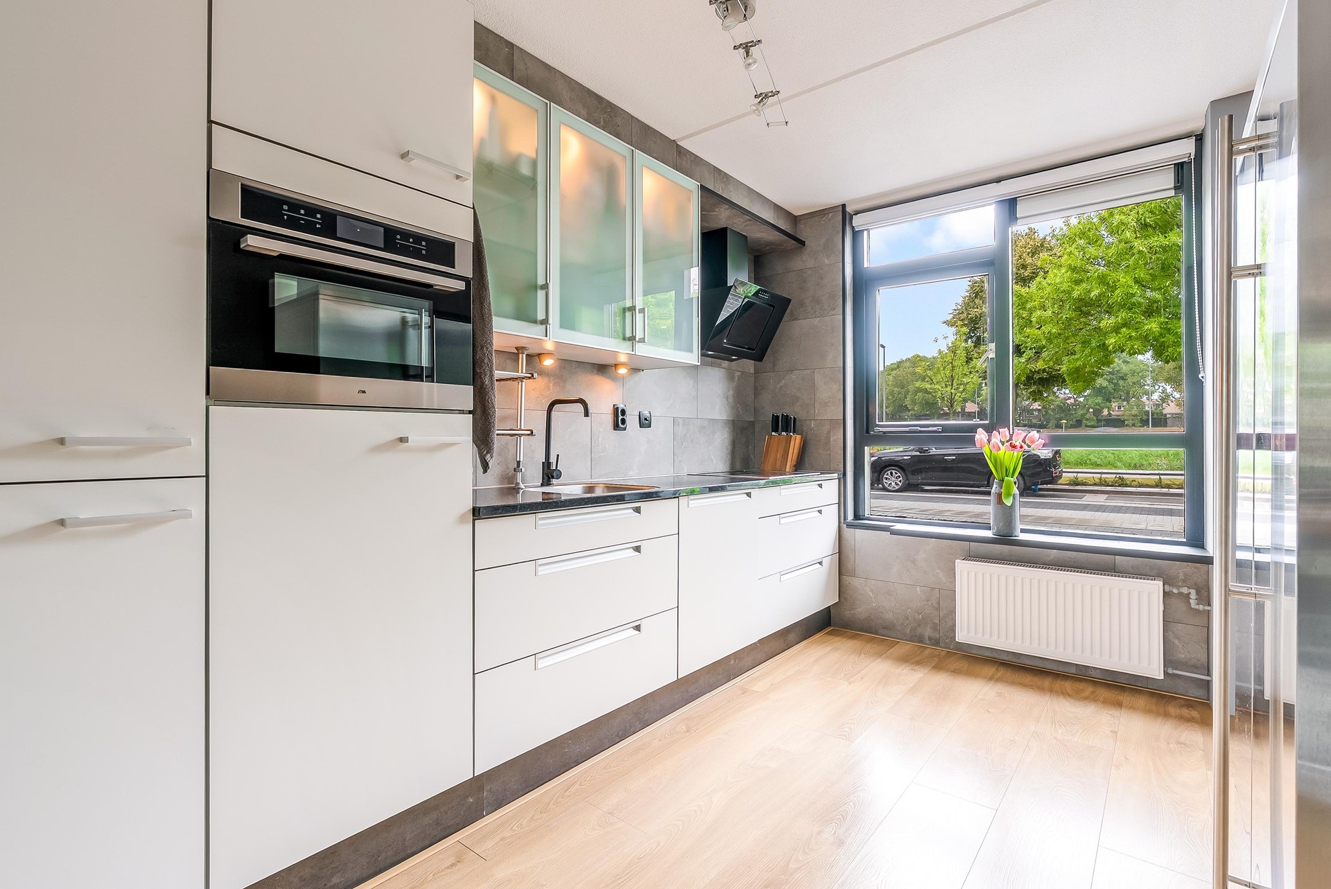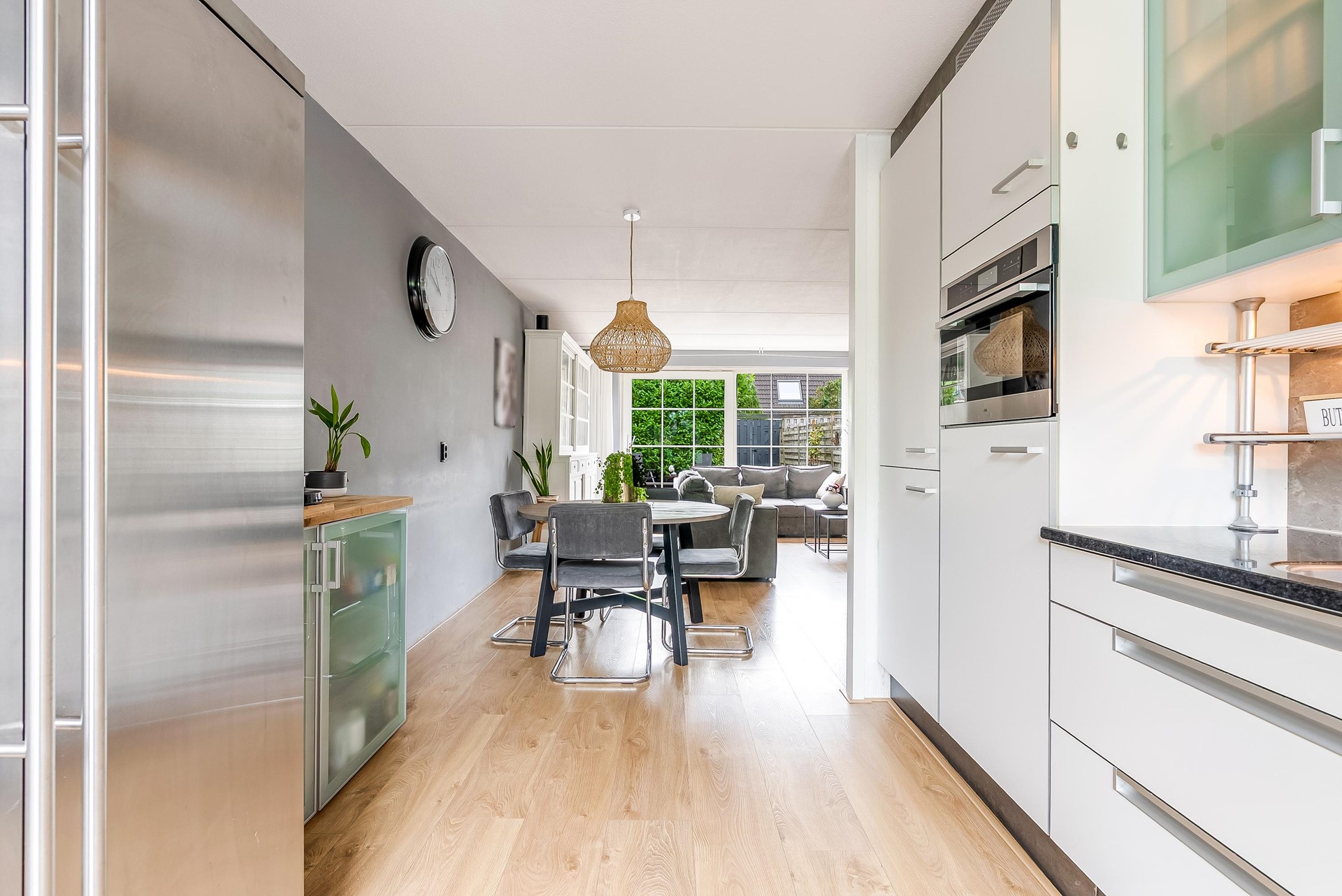 Aan de voorzijde bevindt zich de halfopen keuken, voorzien van diverse inbouwapparatuur: keramische kookplaat, combi-oven, afzuigkap (2023), vaatwasser (2019) en een royale Amerikaanse koelkast (2016).