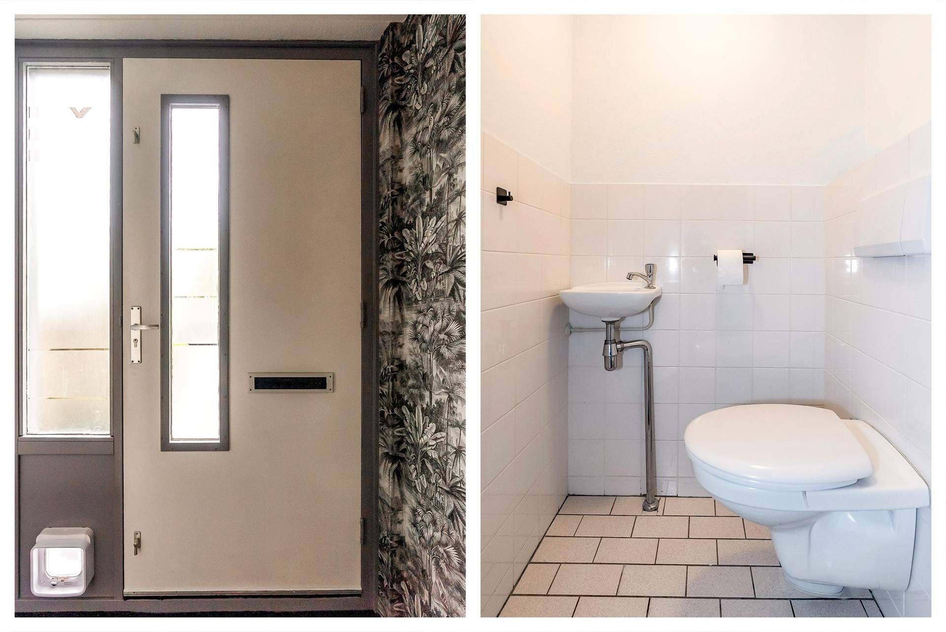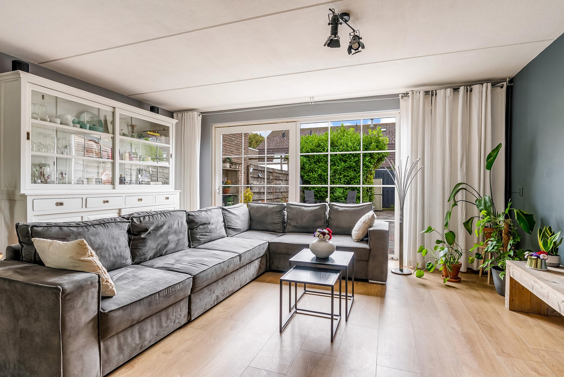 Binnenkomst in hal met meterkast, trapopgang en toiletruimte. De ruime woonkamer (ca. 39,8 m²) beschikt over een nette laminaatvloer en een grote schuifpui waardoor er veel daglicht binnenvalt. De schuifpui geeft directe toegang tot de ruime achtertuin.