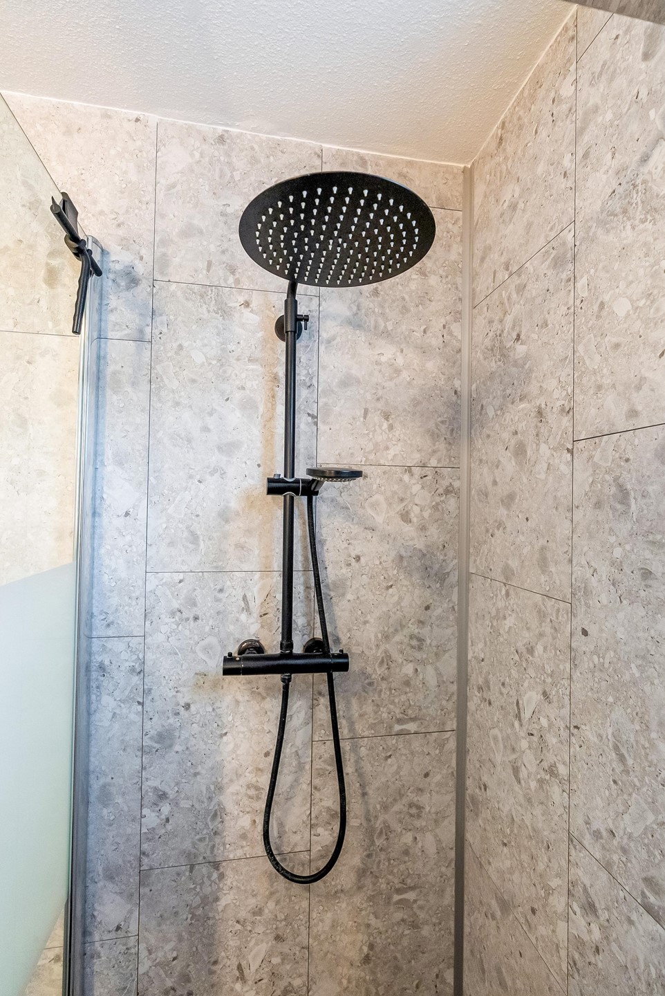 Overloop met toegang tot de drie slaapkamers van ca. 14 m², 12,3 m² en 8,5 m², allen voorzien van laminaatvloeren en raambekleding. De volledig vernieuwde badkamer uit 2022 is modern afgewerkt en uitgerust met een ruime inloopdouche met regendouche, wastafelmeubel met twee wastafels en een tweede toilet.