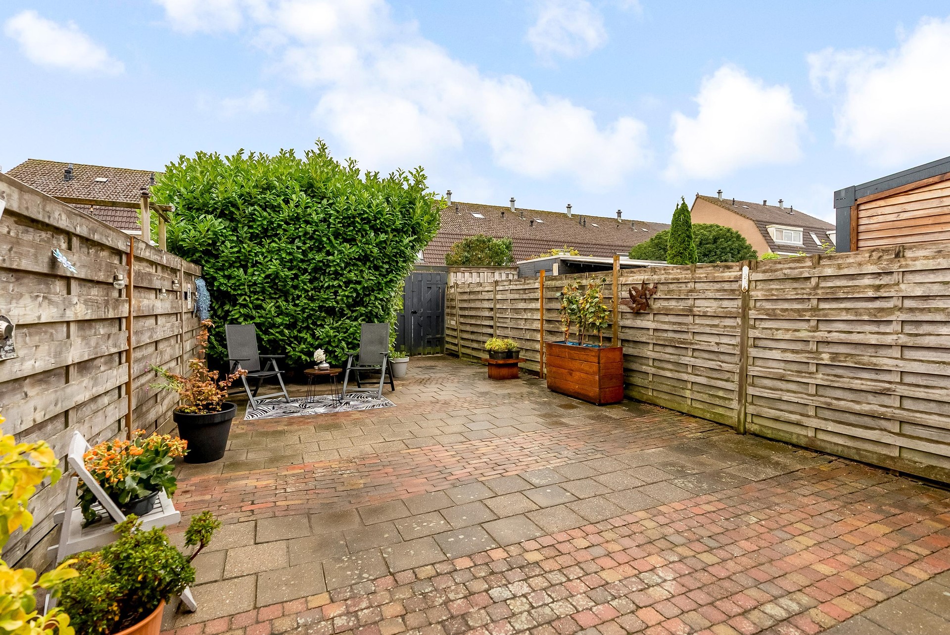 De achtertuin is keurig aangelegd, grotendeels bestraat en beschikt over een ruime stenen berging met elektra, achterom en een elektrisch zonnescherm . Aan de voorzijde is eveneens een verzorgde voortuin aanwezig met de mogelijkheid voor parkeren op eigen terrein!
