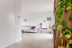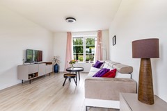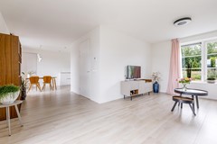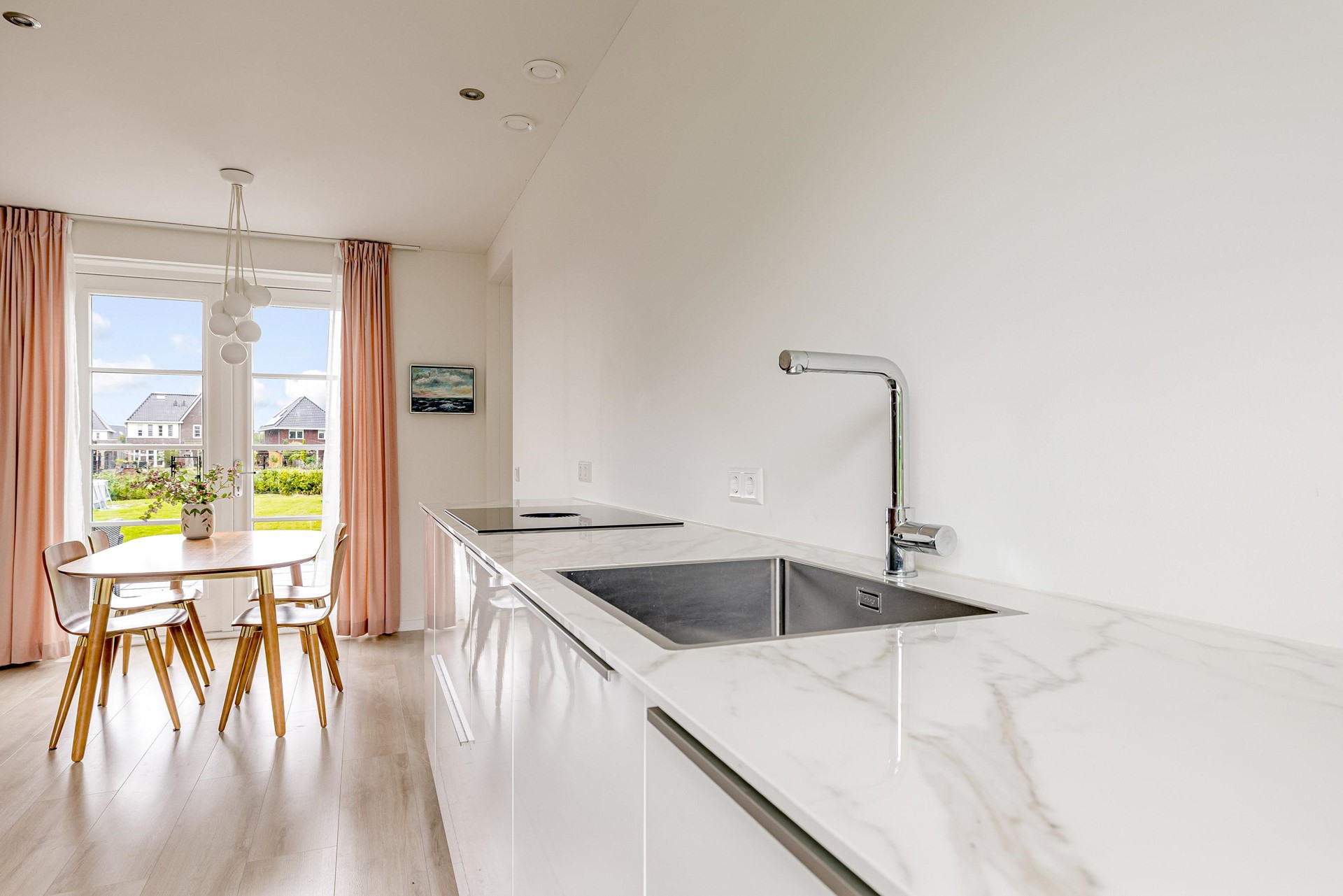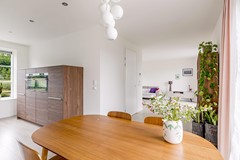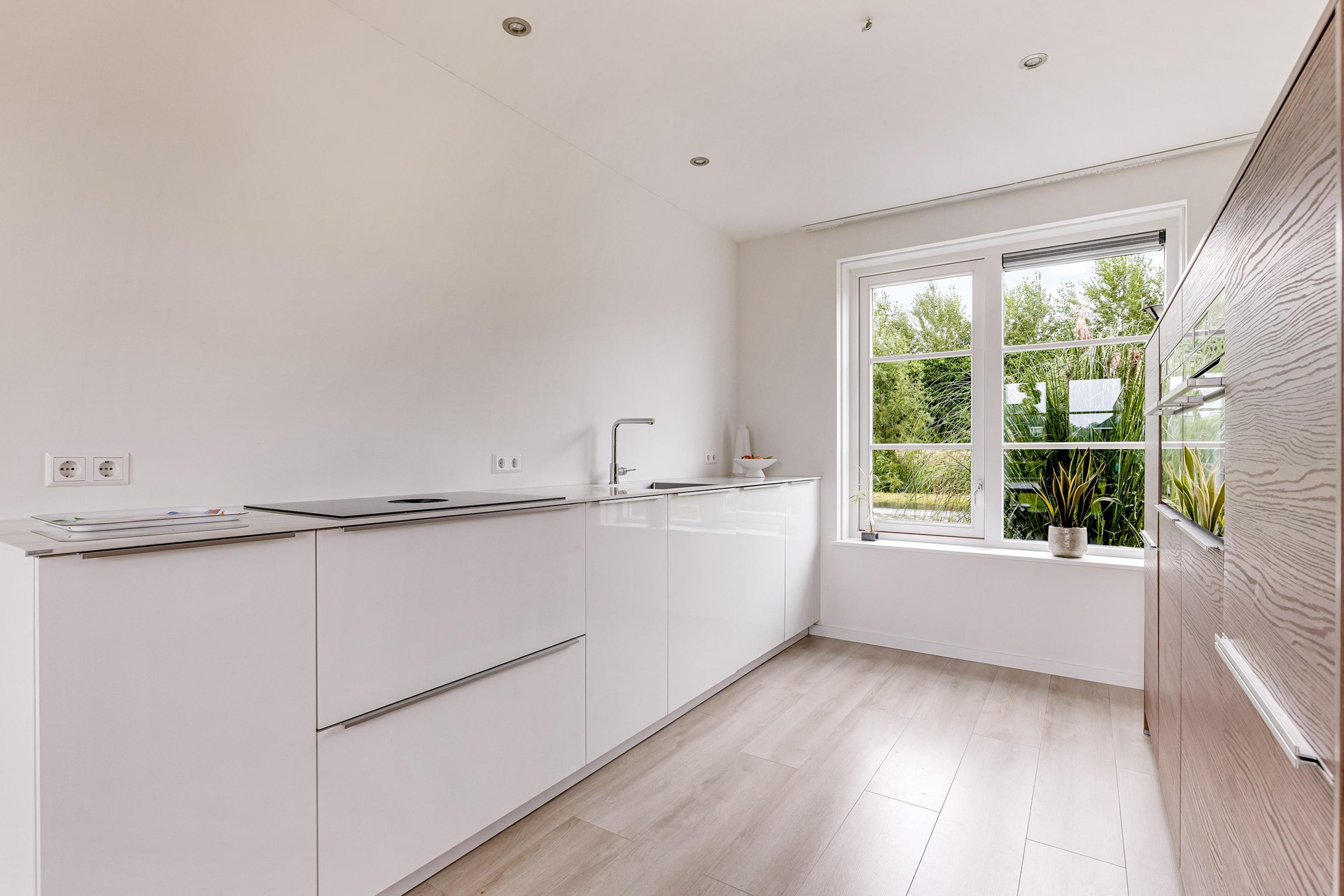 Representatieve entree met modern toilet. De royale leefruimte (plafondhoogte 2,60 m) combineert zit- en eetkamer met een open keuken voorzien van A-merk apparatuur, royaal werkblad en veel kastruimte. Twee openslaande deuren verbinden de living met het zonneterras en de tuin aan het water. Uiteraard overal vloerverwarming/-koeling voor een gelijkmatig en comfortabel klimaat.