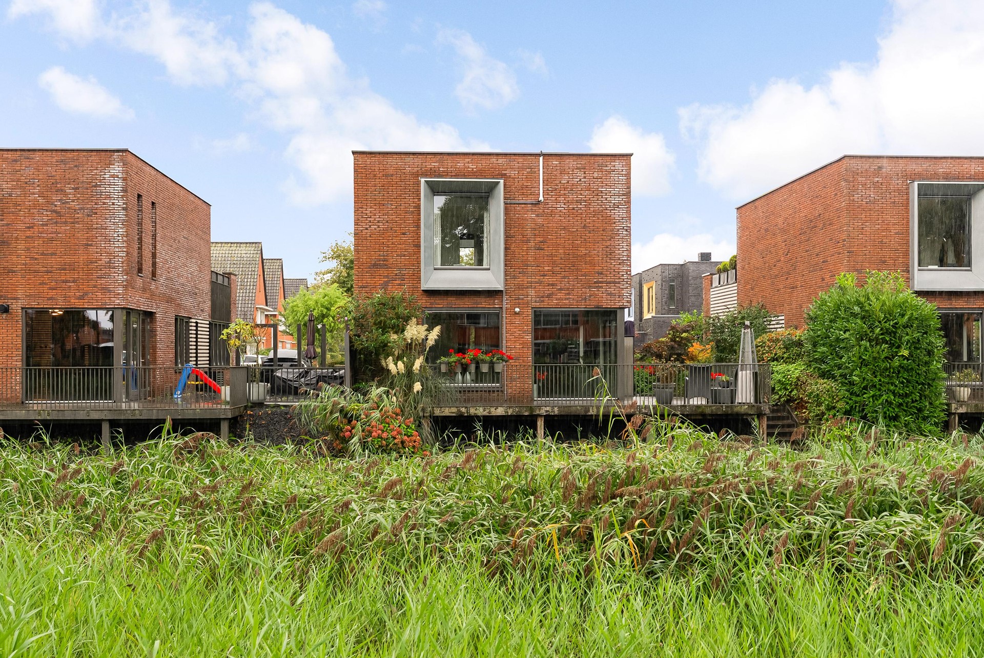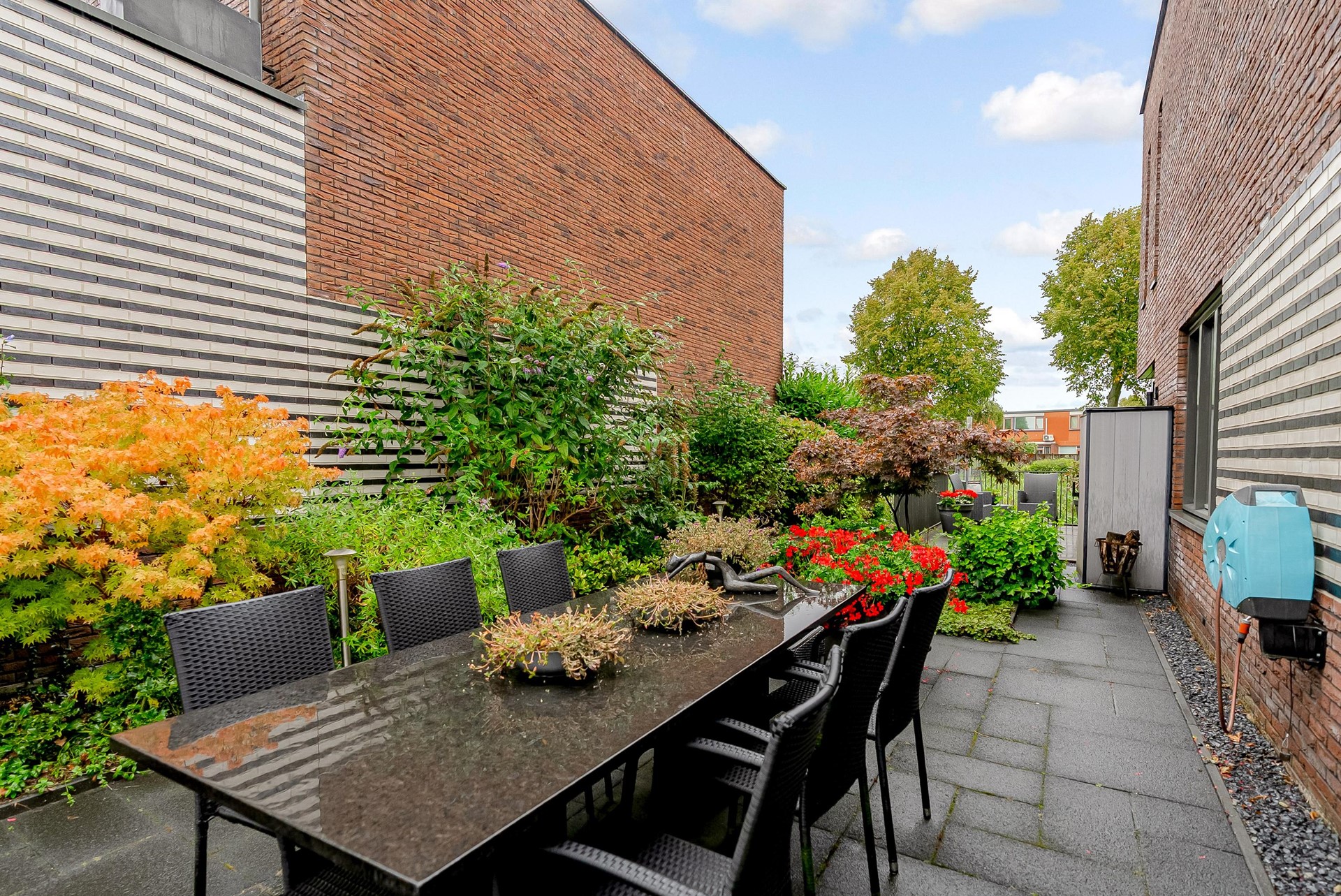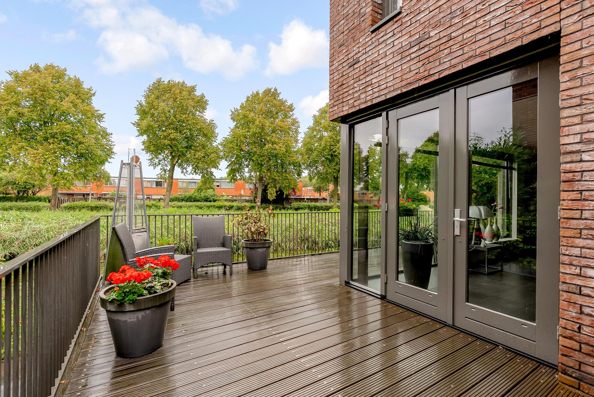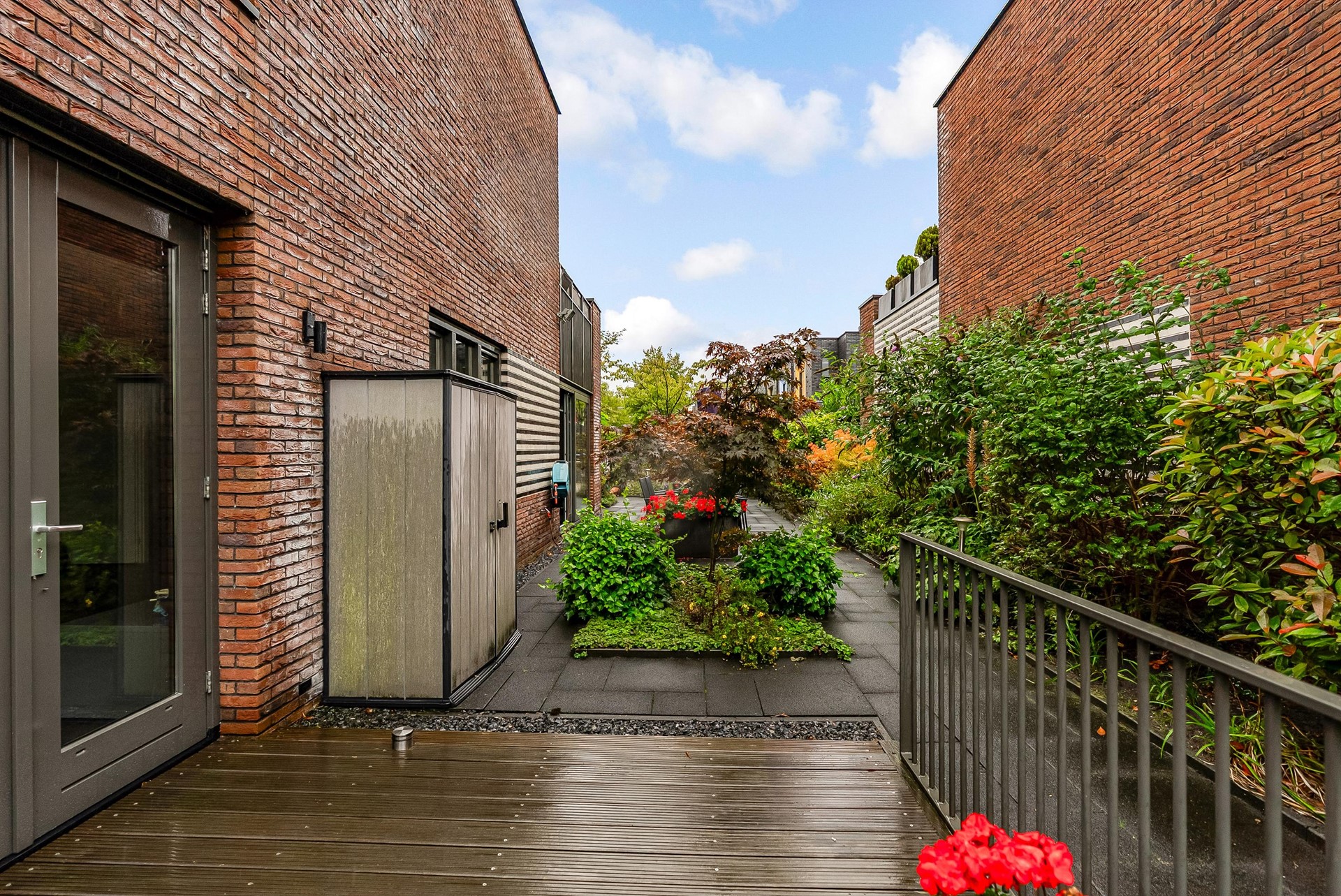 Sfeervolle tuin met sierbestrating en beplanting, aan de achterzijde van de woning een houten vlonderterras over water.