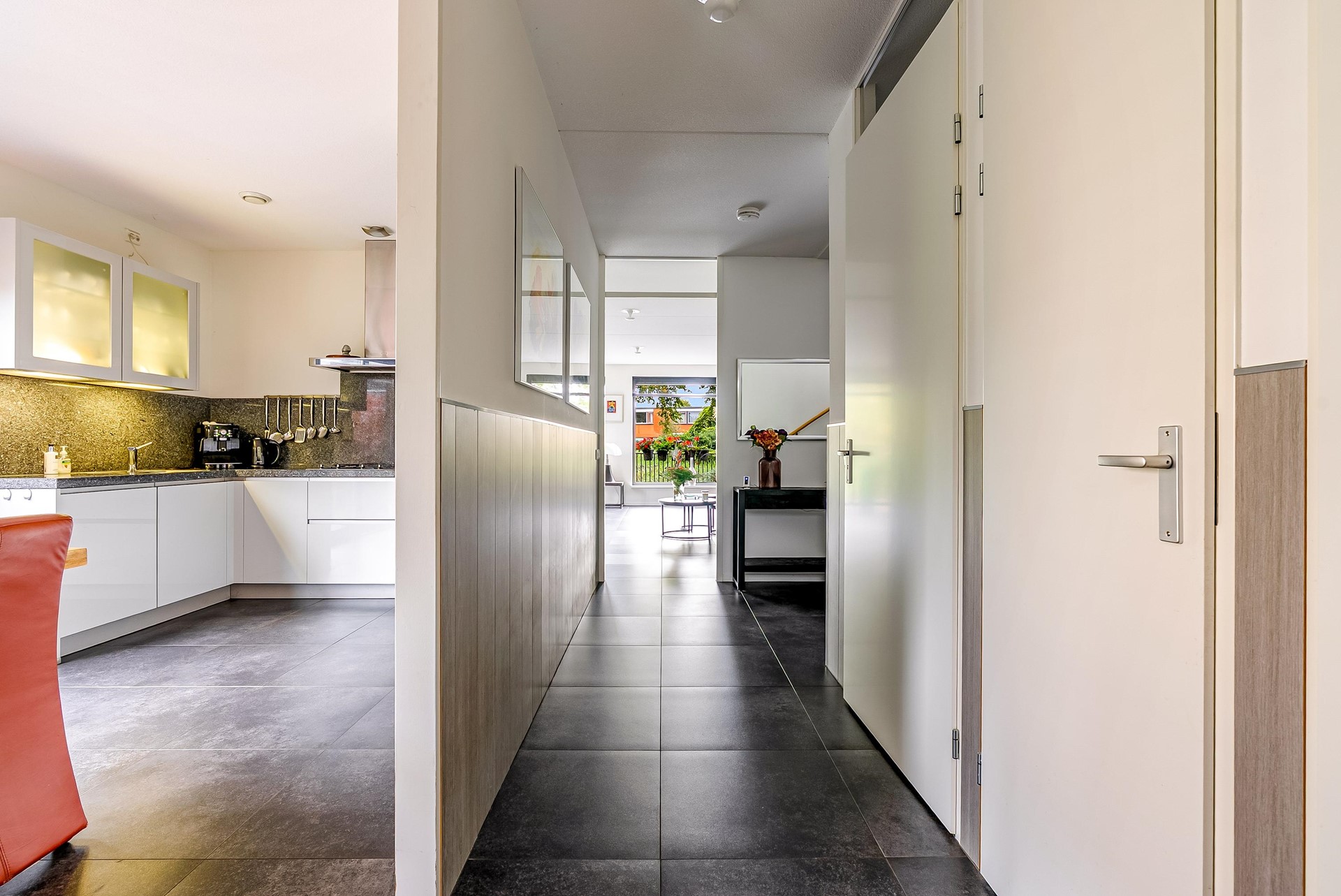 Ruime woonkamer van ca. 43,6 m² met vloerverwarming en veel lichtinval en openslaande deuren naar het terras van 25,1 m² aan het water. Eetgedeelte met moderne keuken (ca. 19,2 m²) met o.a. vaatwasser (AEG), 2× combimagnetron (Whirlpool, 2020), gaskookplaat (Smeg, 2012) en koelkast (Smeg, 2012).
