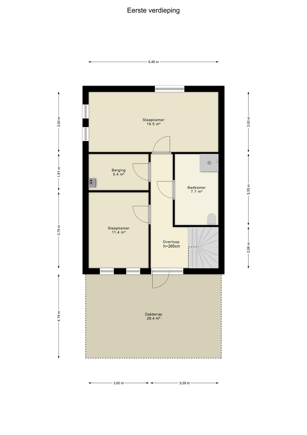 Overloop, twee riante slaapkamers (ca. 19,5 m² en 11,4 m²). Badkamer (ca. 7,7 m²) met douche, wastafel en toilet.