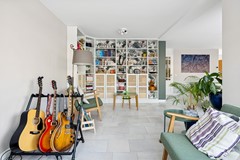 De tuingerichte woonkamer met plavuizenvloer is opvallend ruim en breed opgezet (circa 8,69 meter breed) en beschikt over een extra zijraam en openslaande deuren naar de tuin, wat zorgt voor een prettige lichtinval en een ruimtelijk gevoel. Aansluitend is er volop ruimte voor een grote eettafel.