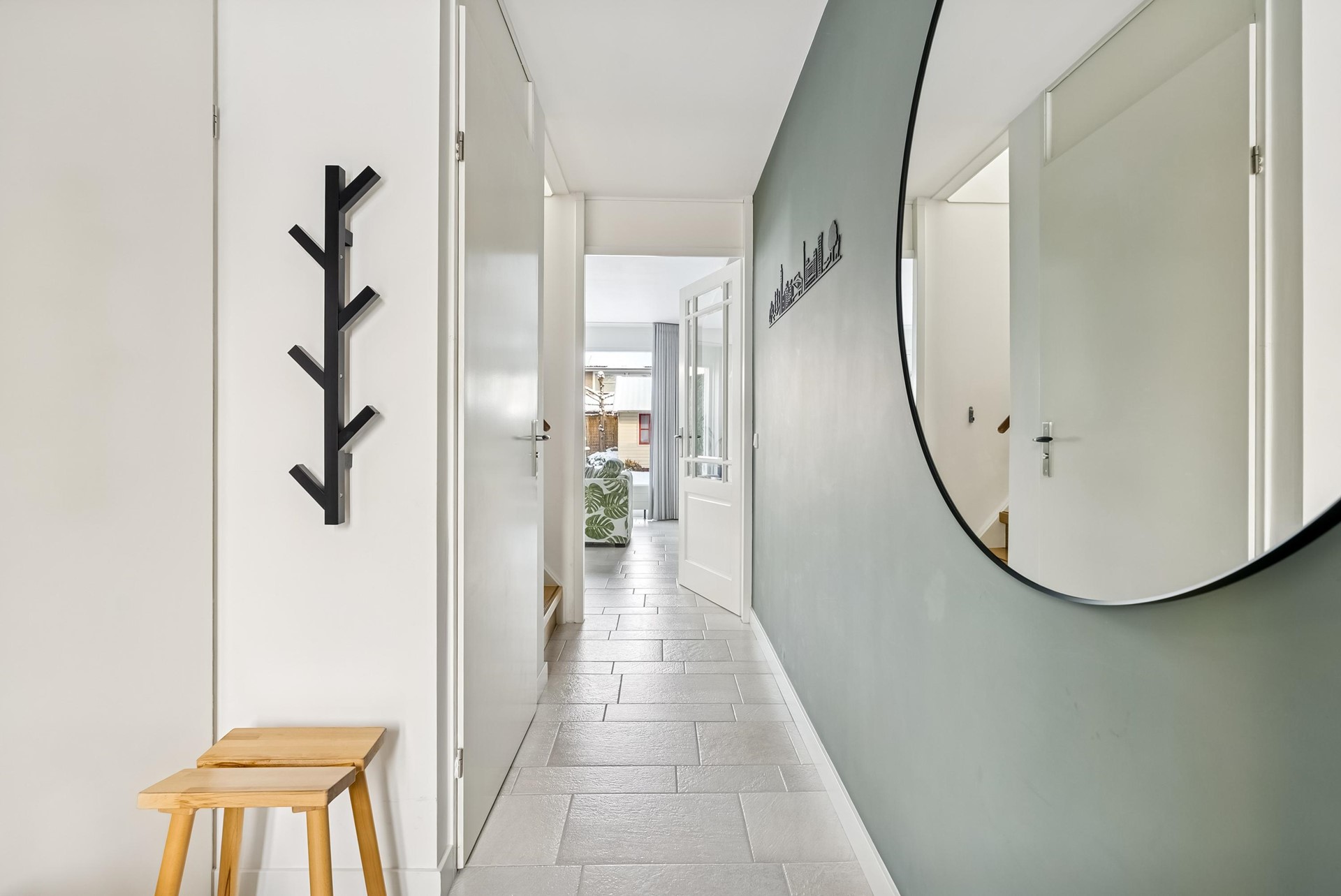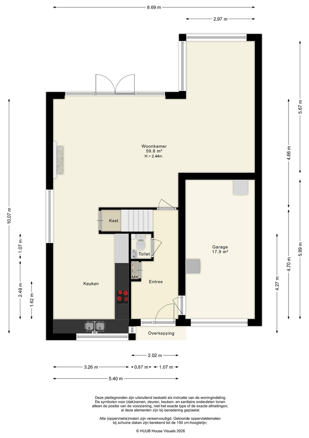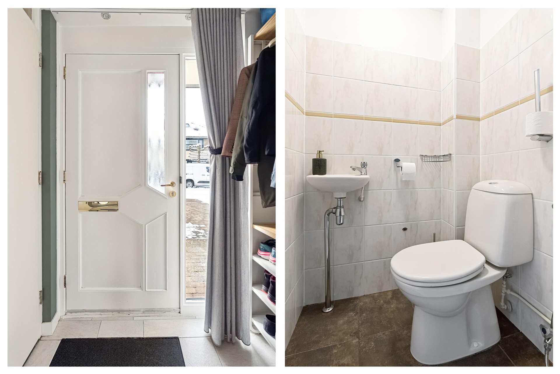 Entree, hal met toiletruimte. Vanuit de hal is de inpandig bereikbare stenen garage toegankelijk (circa 5,99 x 2,97 meter), voorzien van een opstelplaats voor wasmachine en droger.