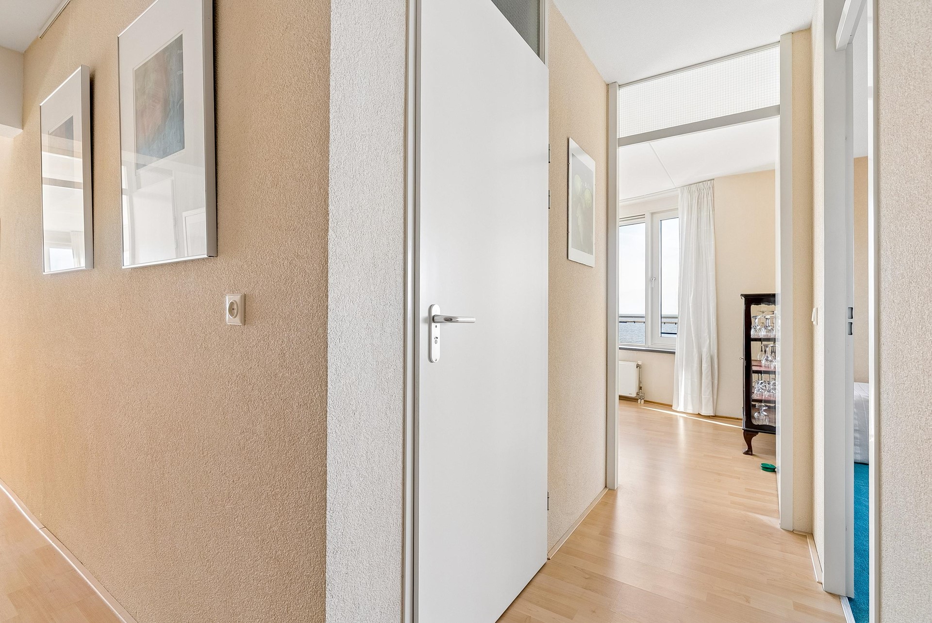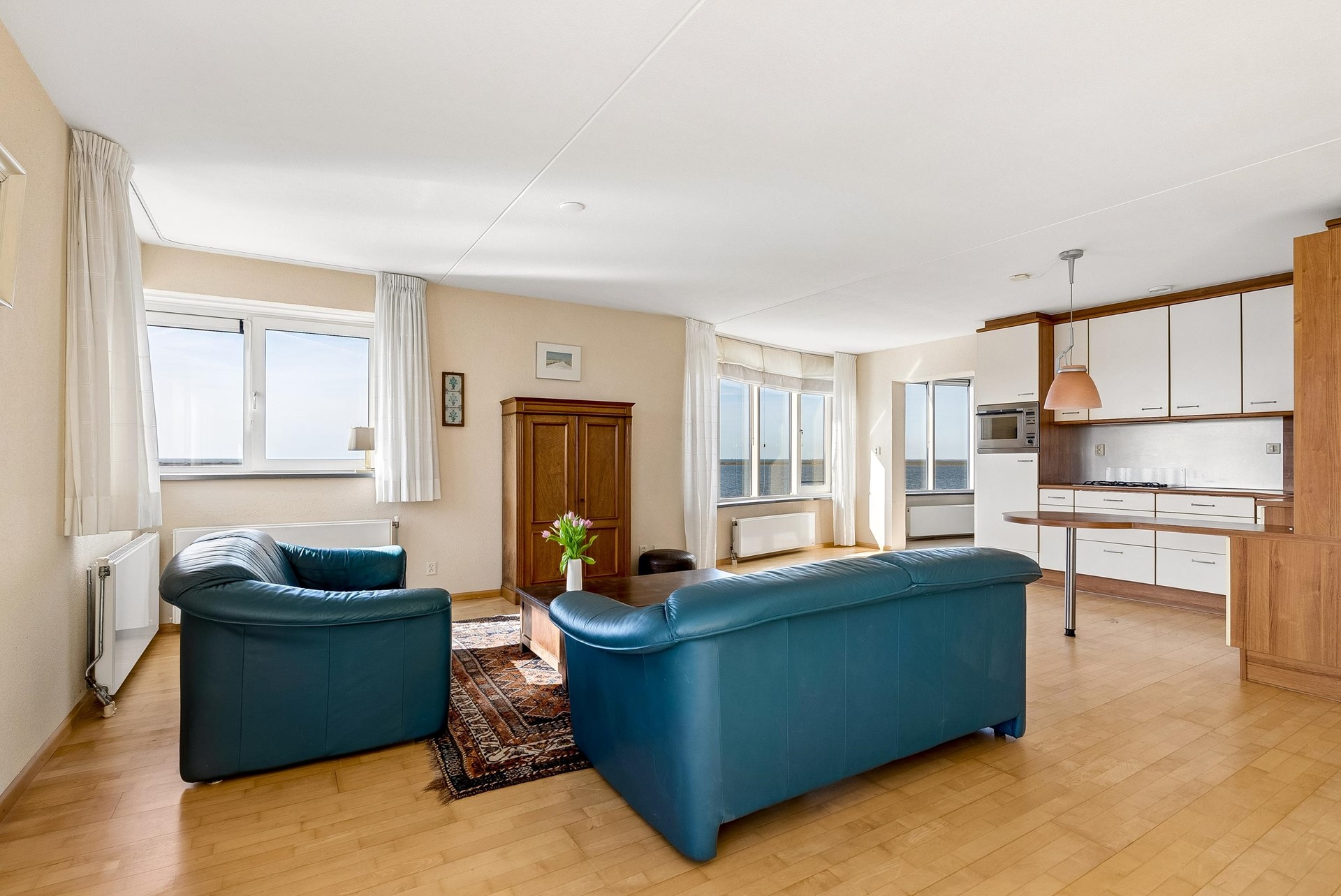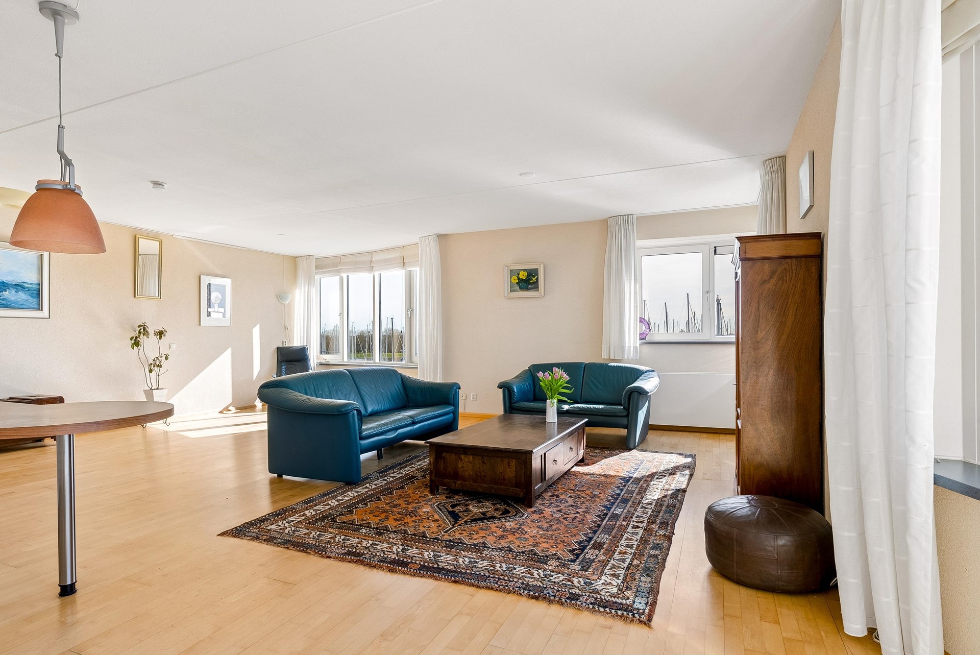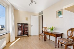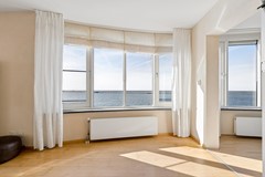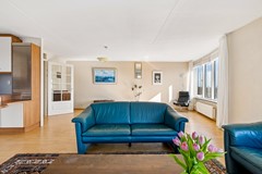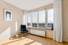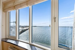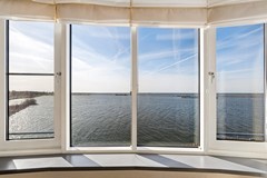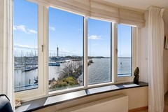 De woonkamer vormt zonder twijfel het absolute hoogtepunt van dit appartement. Met een oppervlakte van maar liefst ca. 50,7 m² is dit een bijzonder royale leefruimte. De grote raampartijen en de unieke vorm van de gevel zorgen voor een panoramisch uitzicht over het water en een prachtige lichtinval gedurende de dag. Door de ligging op de 3e verdieping geniet je hier van extra privacy en een vrij uitzicht zonder inkijk.