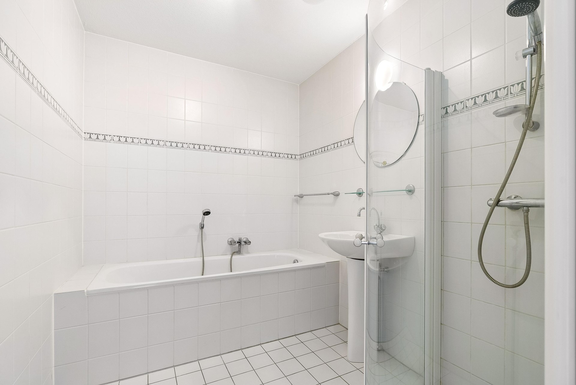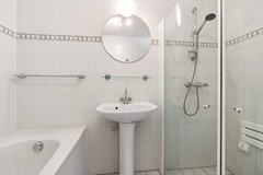 De volledig betegelde badkamer heeft een oppervlakte van circa 5,0 m² en is uitgerust met een ligbad, douche en wastafel. Daarnaast is er een separate toiletruimte en separate wasruimte aanwezig.