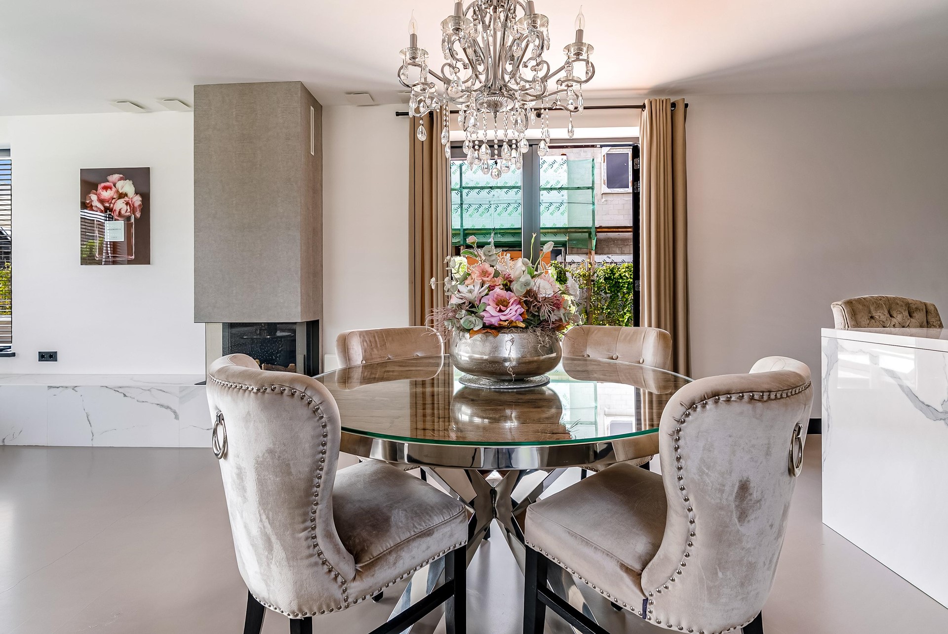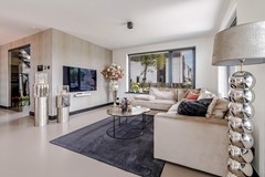 De ruime en sfeervolle woonkamer (55,1 m²) beschikt over een moderne gashaard (merk: Dru). De grote raampartijen zorgen voor veel natuurlijk licht. De ruimte biedt voldoende plek voor een comfortabele zithoek en een grote eettafel.