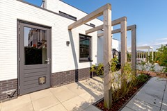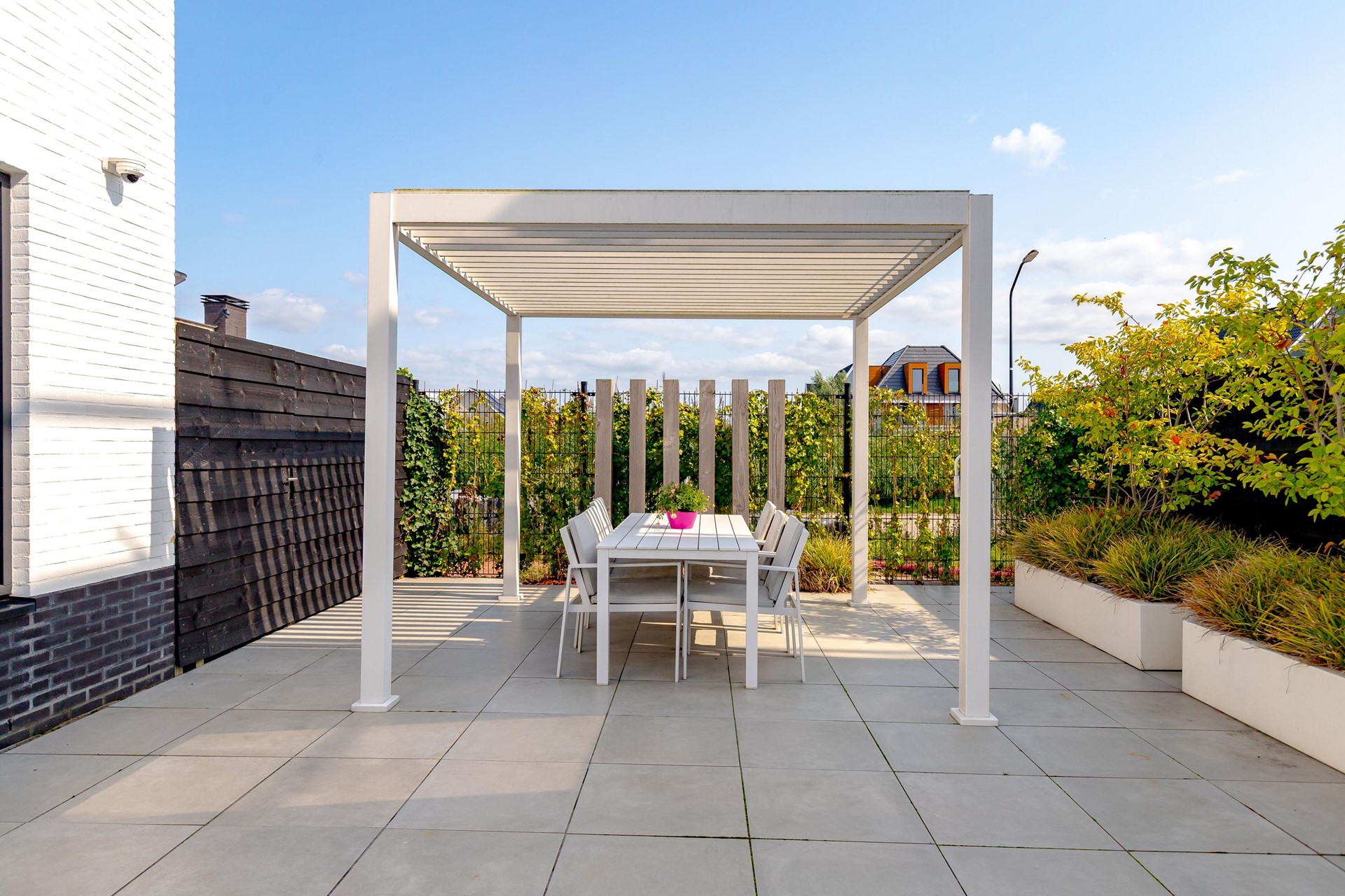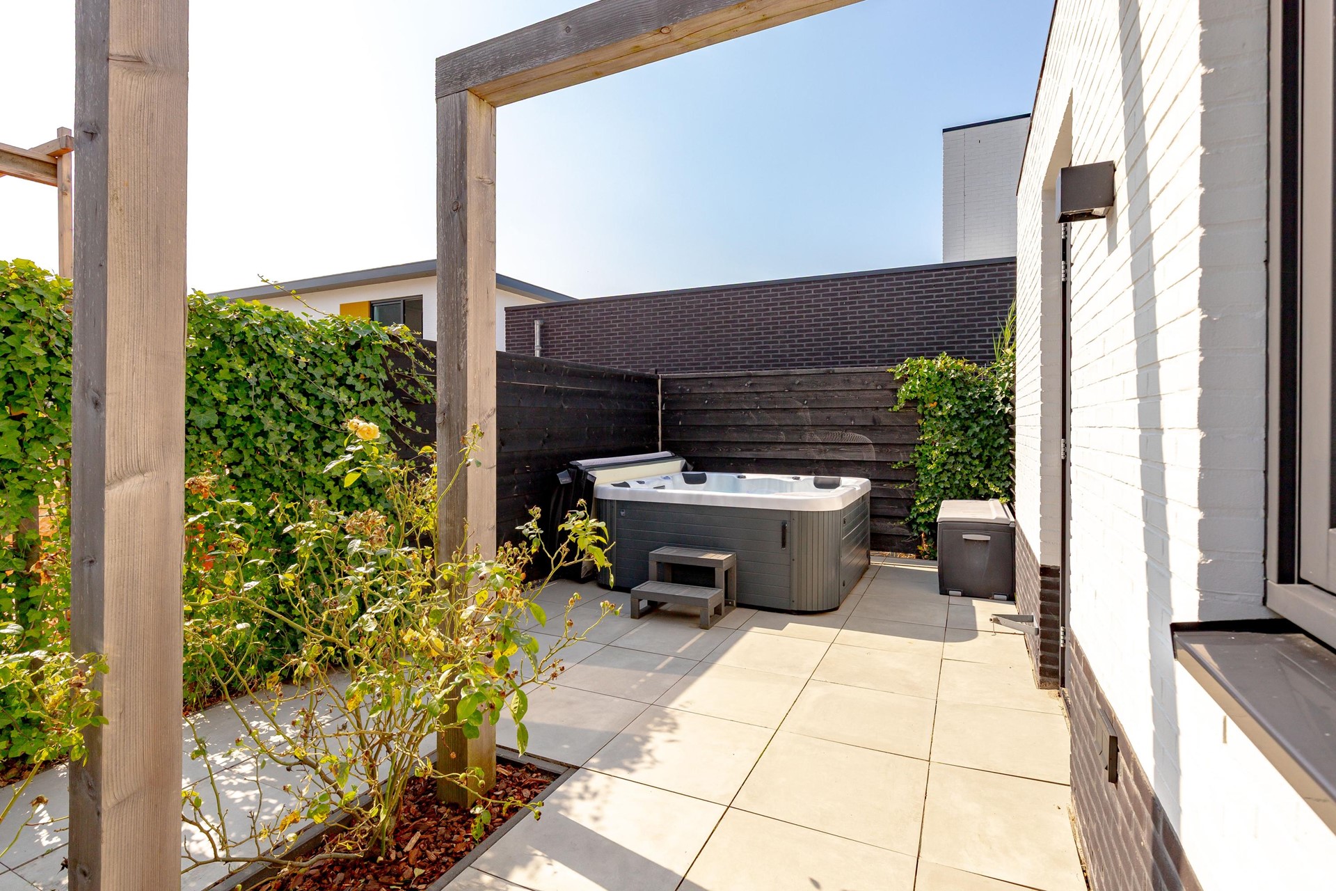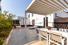 Vanuit de woonkamer en keuken bereikt u de tuin via openslaande deuren. De tuin is modern en onderhoudsvriendelijk aangelegd met lichte betegeling, stijlvolle plantenbakken en mooie afscheidingen voor extra privacy. Hier vindt u een veranda met bedienbare lamellen zonoverkapping, meerdere zonneterrassen, jacuzzi en zelfs een buitendouche.