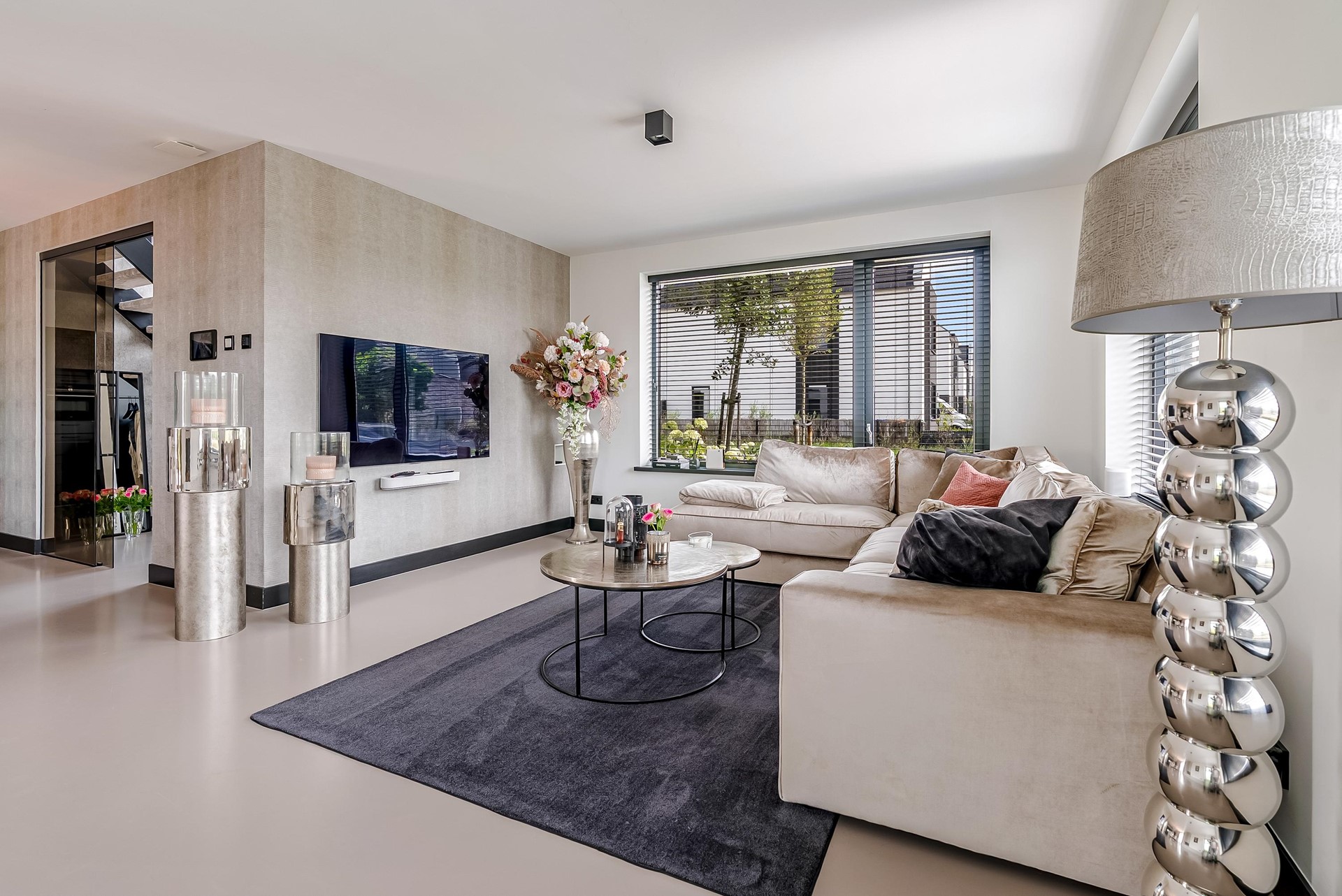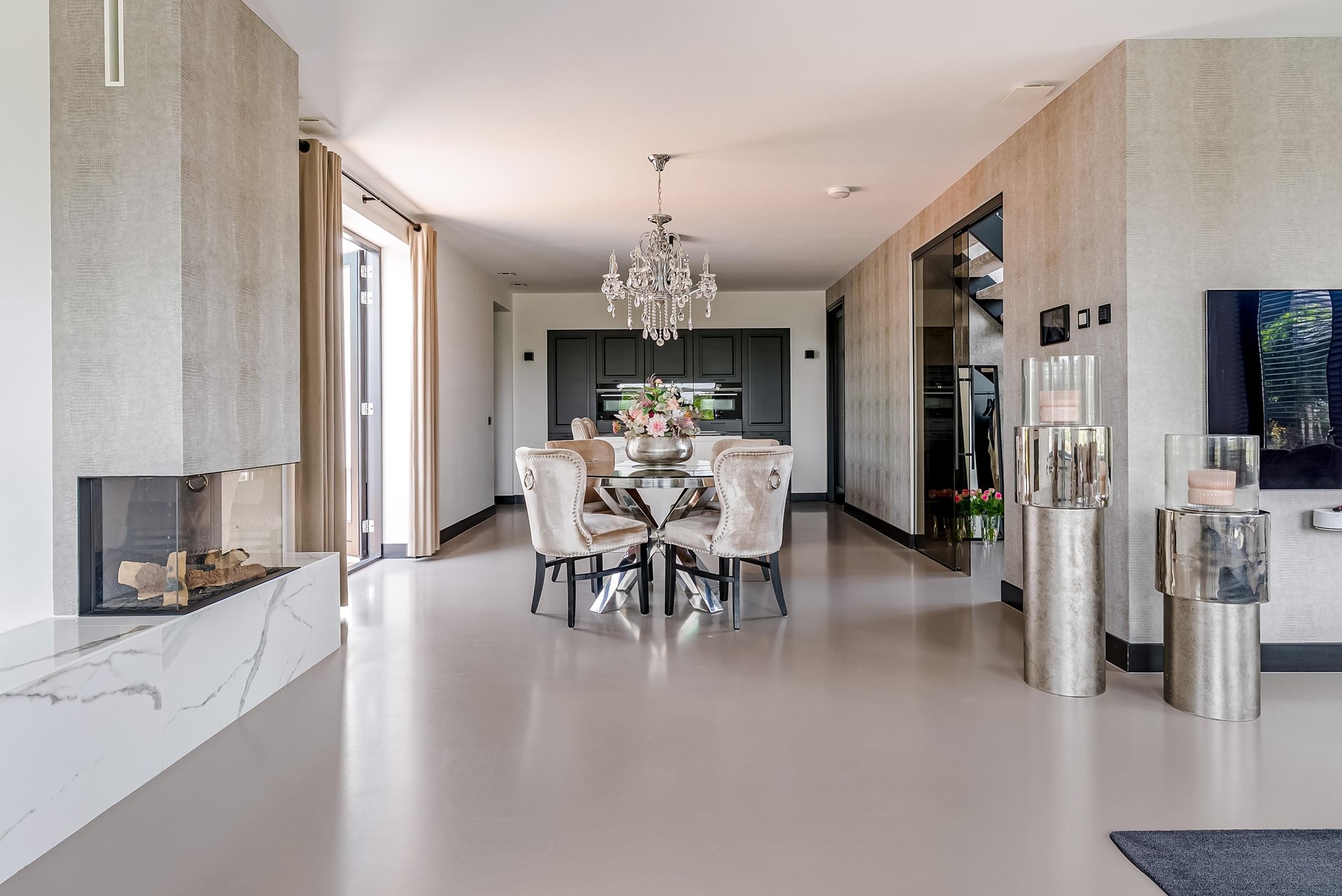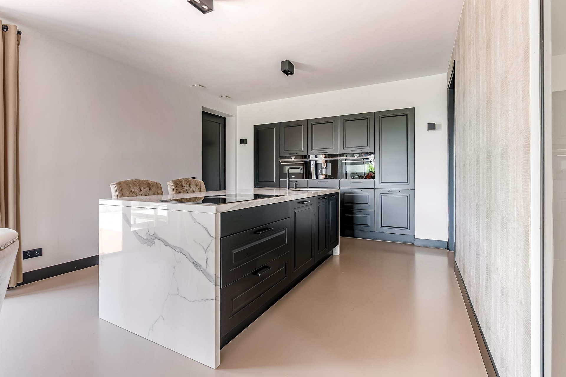 De gehele begane grond is voorzien van een stijlvolle gietvloer met vloerverwarming/-koeling die doorloopt over de gehele verdieping.