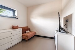 Direct naast de keuken bevindt zich de praktische bijkeuken (11,6 m²), waar de wasmachine- en drogeropstelling staan, evenals kastruimte met warmtepomp en de omvormer voor de zonnepanelen en ventilatiesysteem. Deze ruimte is voorzien van een verlaagd plafond met inbouwspots en biedt toegang tot de garage/berging (ca. 3,80 m. x 3.00 m.) en tevens deur naar de tuin.