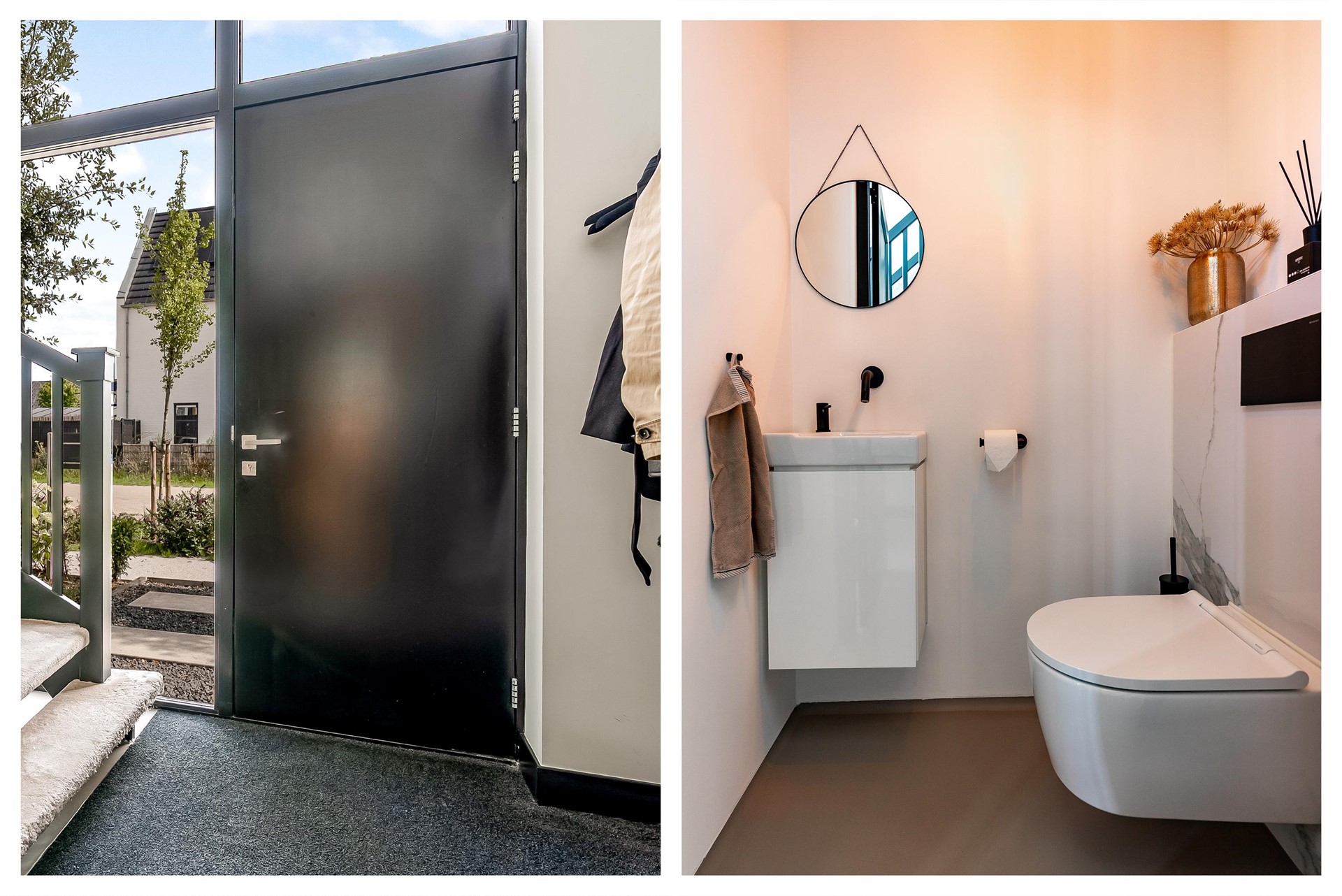Bij binnenkomst vindt u de meterkast, een toiletruimte met zwevend toilet met automatische bediening en fonteintje, en een fraaie glazen deur die toegang geeft tot de woonkamer.