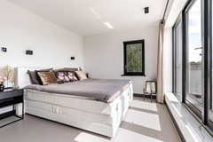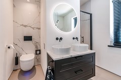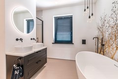 Een schitterende luxe badkamer met een vrijstaand bad, een dubbele wastafel, een inloopdouche met dubbele stortdouche, zwevend sanitair en een hoogwaardige betegeling. Ook de eerste verdieping is voorzien van een schitterende gietvloer met vloerverwarming.