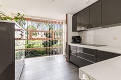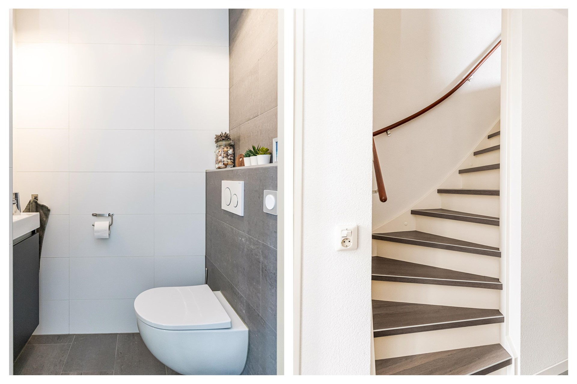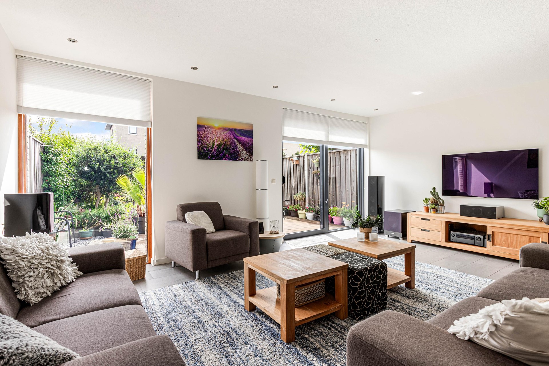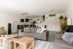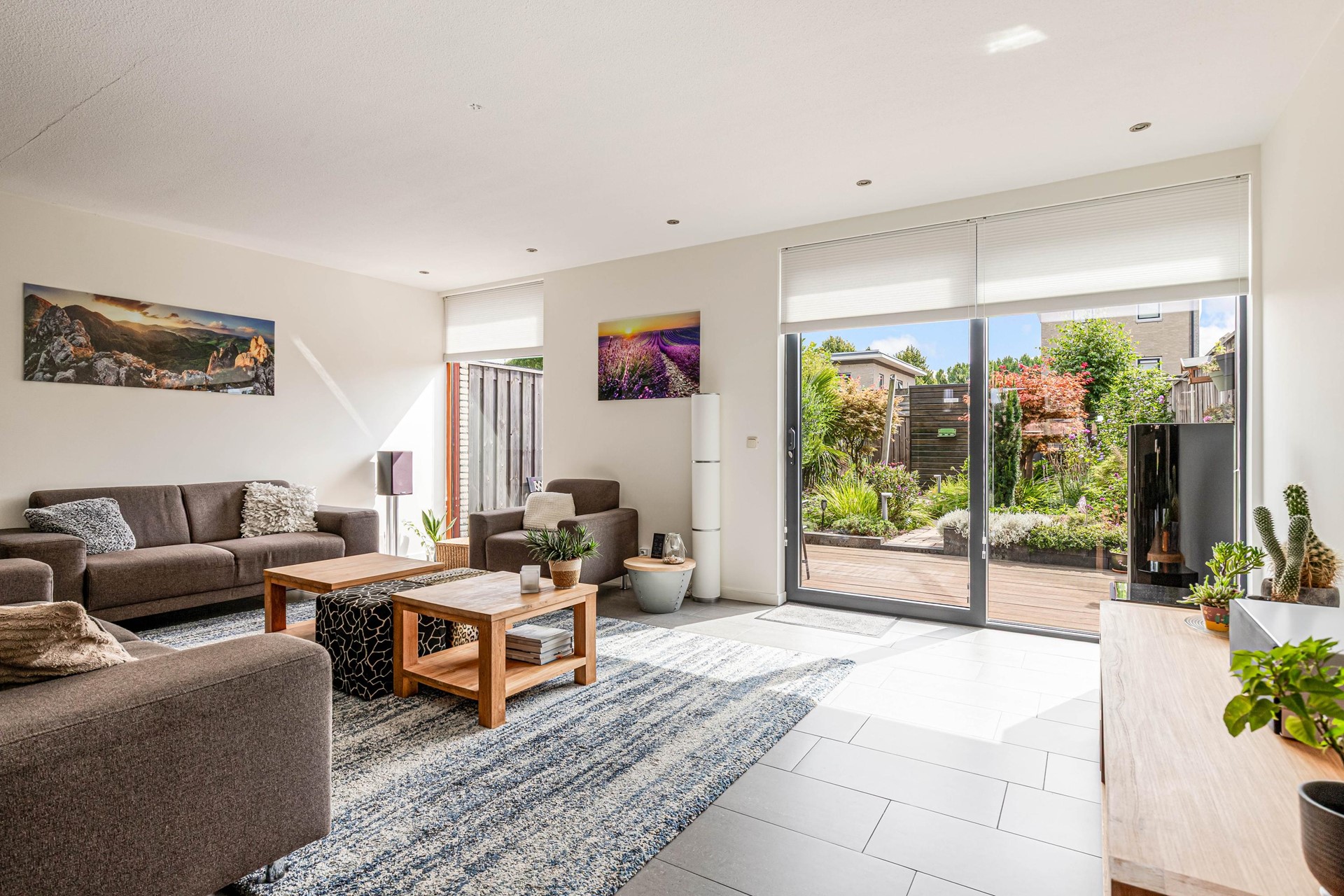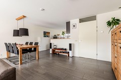 U betreedt de woning via een verzorgde entree, met een garderobe, trapkast voor extra bergruimte en een toiletruimte die in 2019 gemoderniseerd is. Aan de voorzijde bevindt zich de strakke open keuken (geplaatst in 2015). Deze is uitgevoerd in modern hoogglans grijs met een fris wit werkblad en uitgerust met inbouwapparatuur, waaronder een inductiekookplaat, afzuigkap, koelkast, vriezer, combimagnetron en vaatwasser. De keuken staat in directe verbinding met de royale, uitgebouwde woonkamer, waardoor er een ruime open leefruimte ontstaat. De royale en lichte leefruimte heeft een oppervlakte van circa 54,5 m². U geniet hier van een heerlijk comfort dankzij de vloerverwarming en de afwerking met keramische vloertegels over de gehele begane grond. De ruimte wordt overspoeld met natuurlijk licht door de grote raampartijen. Extra pluspunt: de schuifpui aan de achterzijde is in 2021 vernieuwd en uitgerust met hoog rendement HR++ glas, wat zorgt voor optimale isolatie en een perfecte verbinding met de tuin.